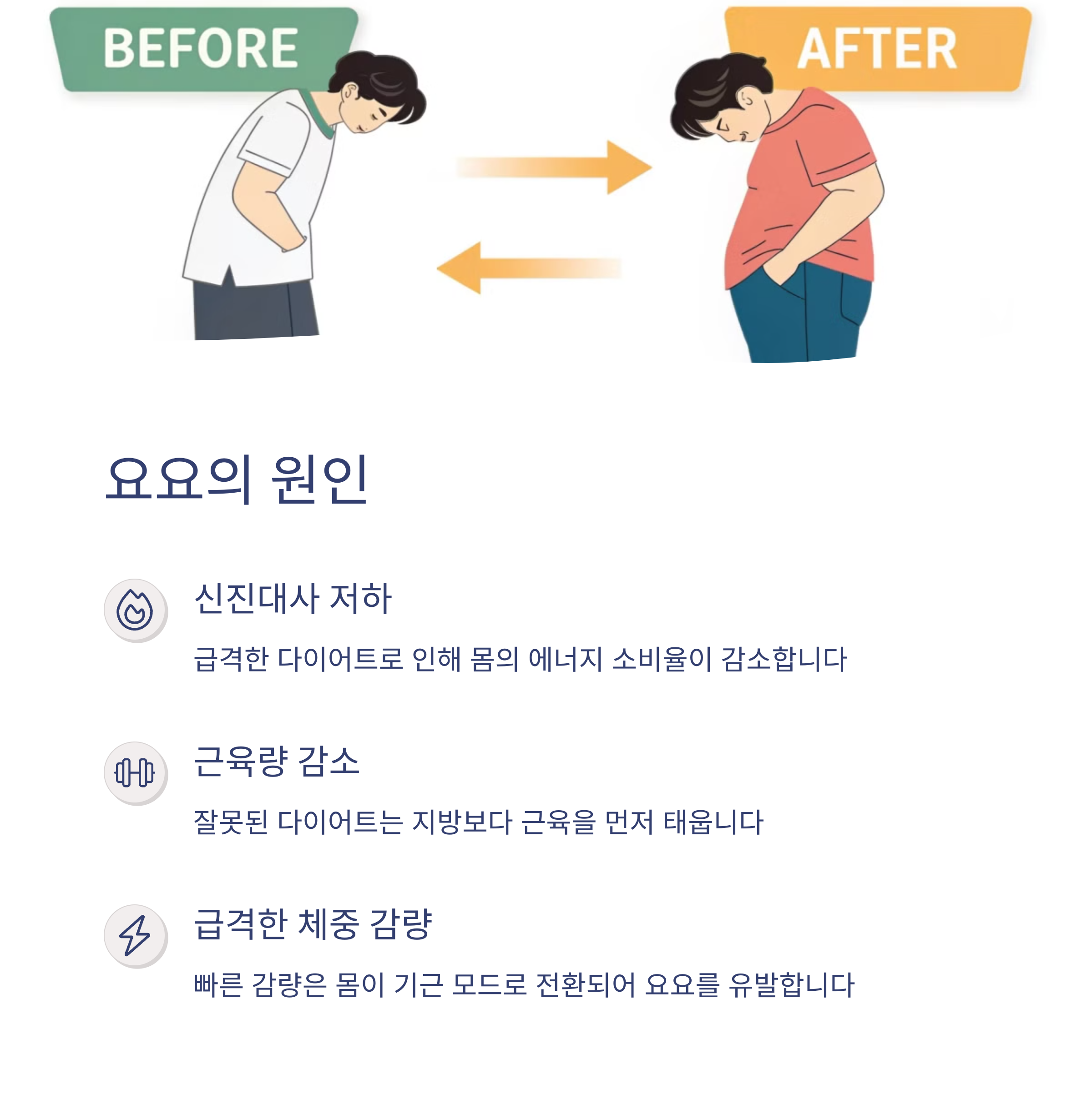 빠른 감량은 신진대사를 저하시켜 몸이 적은 칼로리로도 체중을 유지하려 하기 때문에 요요현상이 발생하기 쉽습니다.