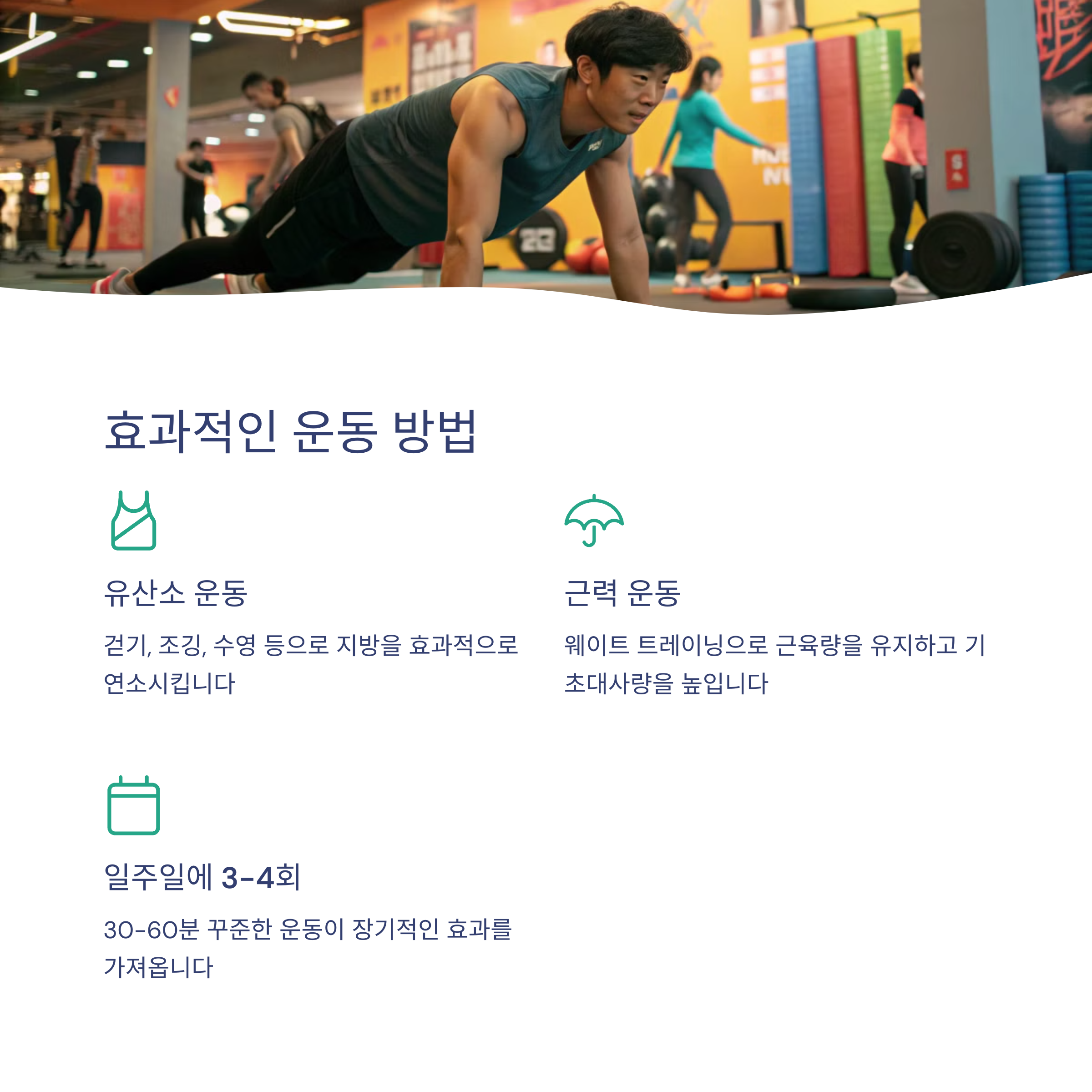 유산소 운동은 체지방 감량에 효과적이며, 근력 운동은 신진대사를 높여 요요현상을 방지합니다.