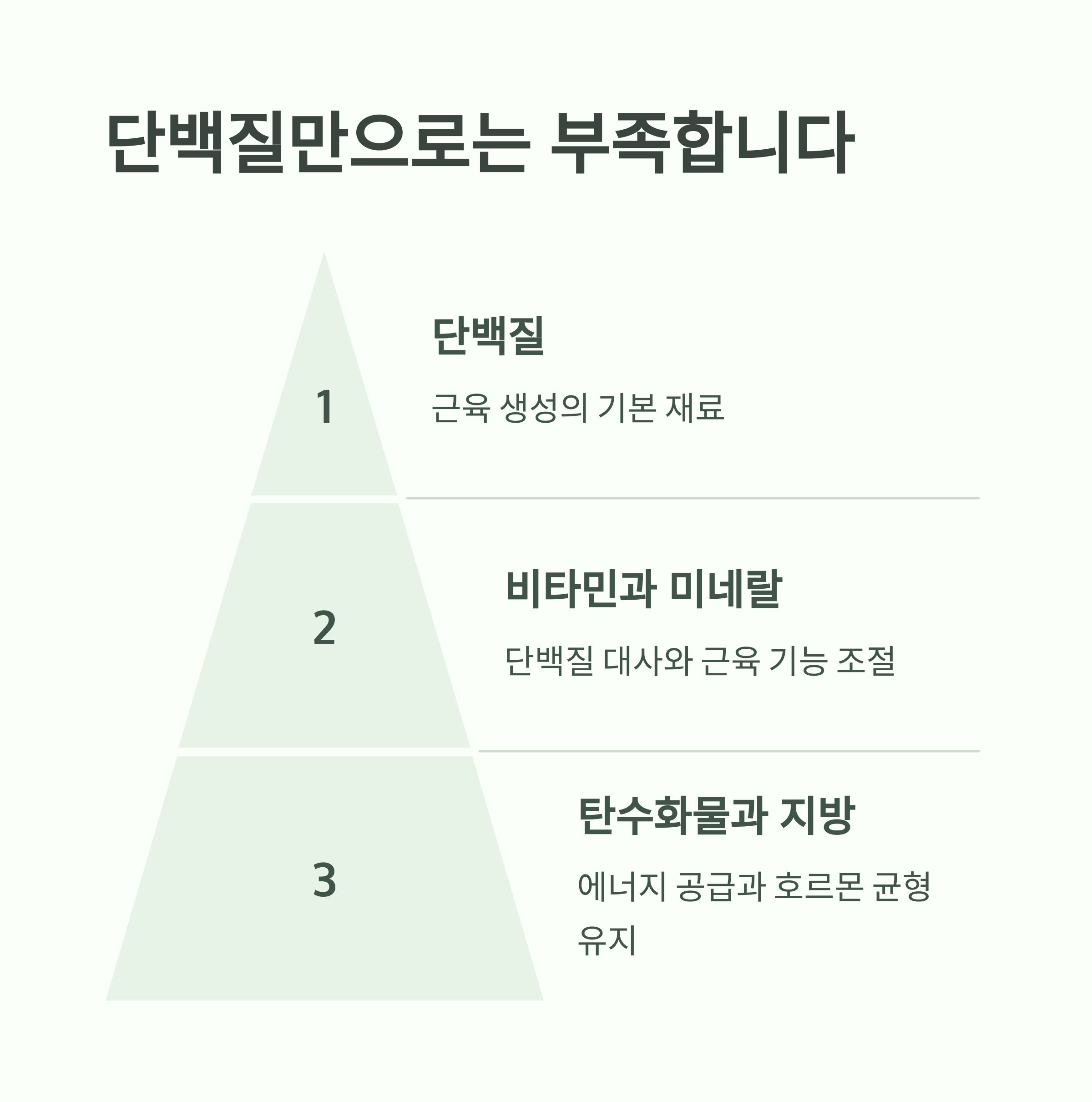 단백질 섭취는 근육 성장과 회복을 돕지만, 단백질만 섭취하는 것이 아니라 균형 잡힌 영양소가 함께 필요합니다.