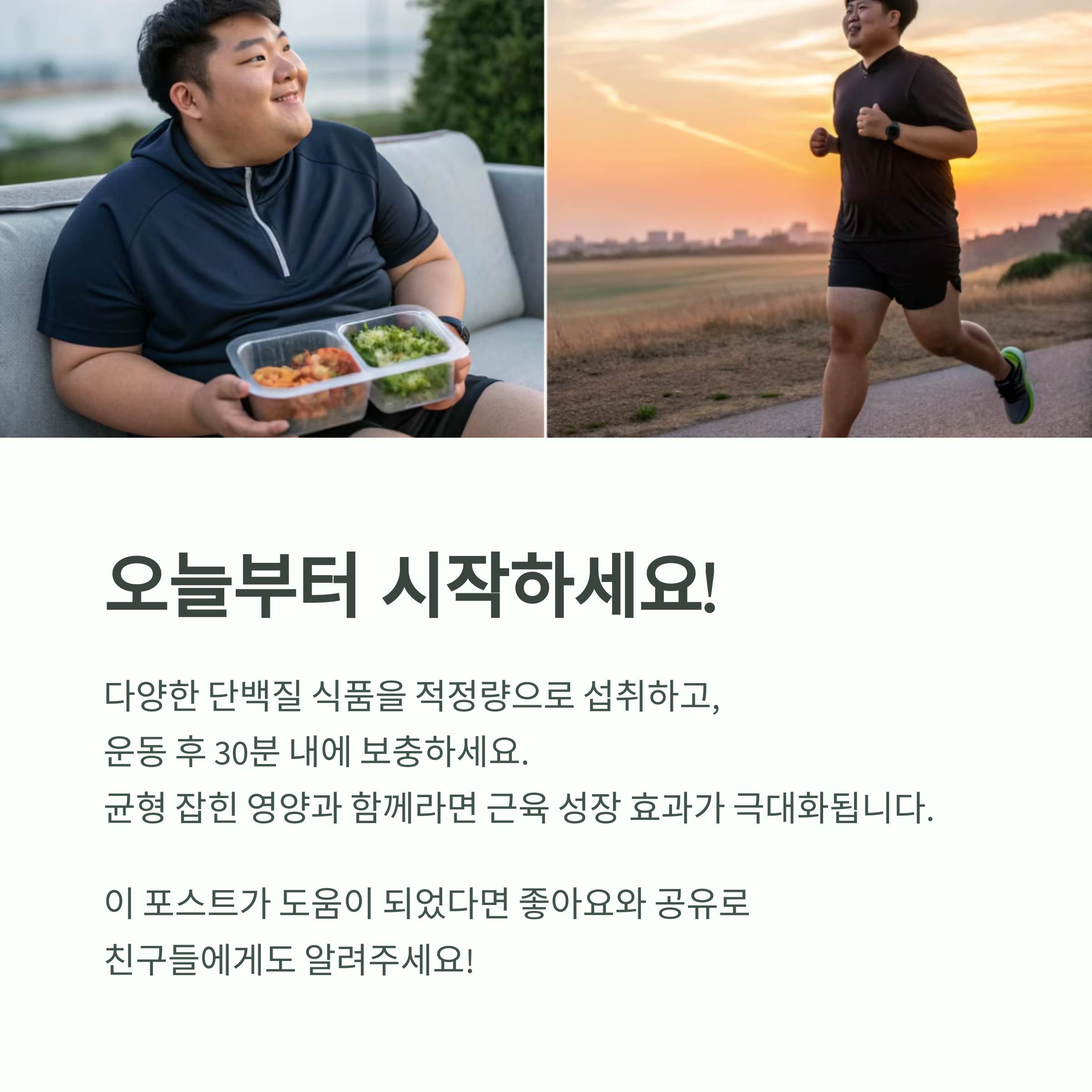운동 후 30~60분 내에 단백질을 섭취하면 근육 회복과 성장을 극대화할 수 있습니다.
