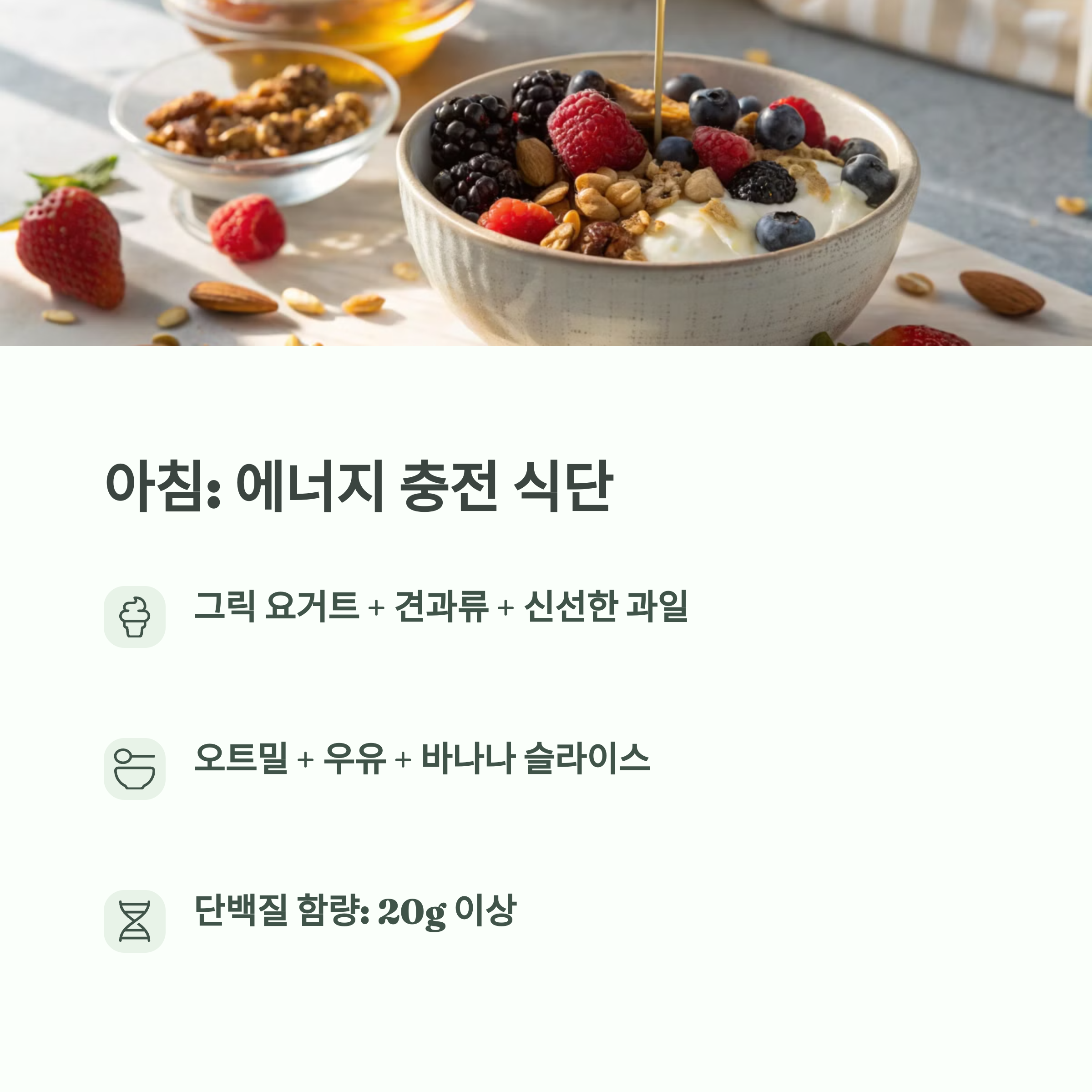 | 그릭요거트볼 | 무가당 요거트, 블루베리, 견과류 | 단백질 풍부, 과일로 단맛 |