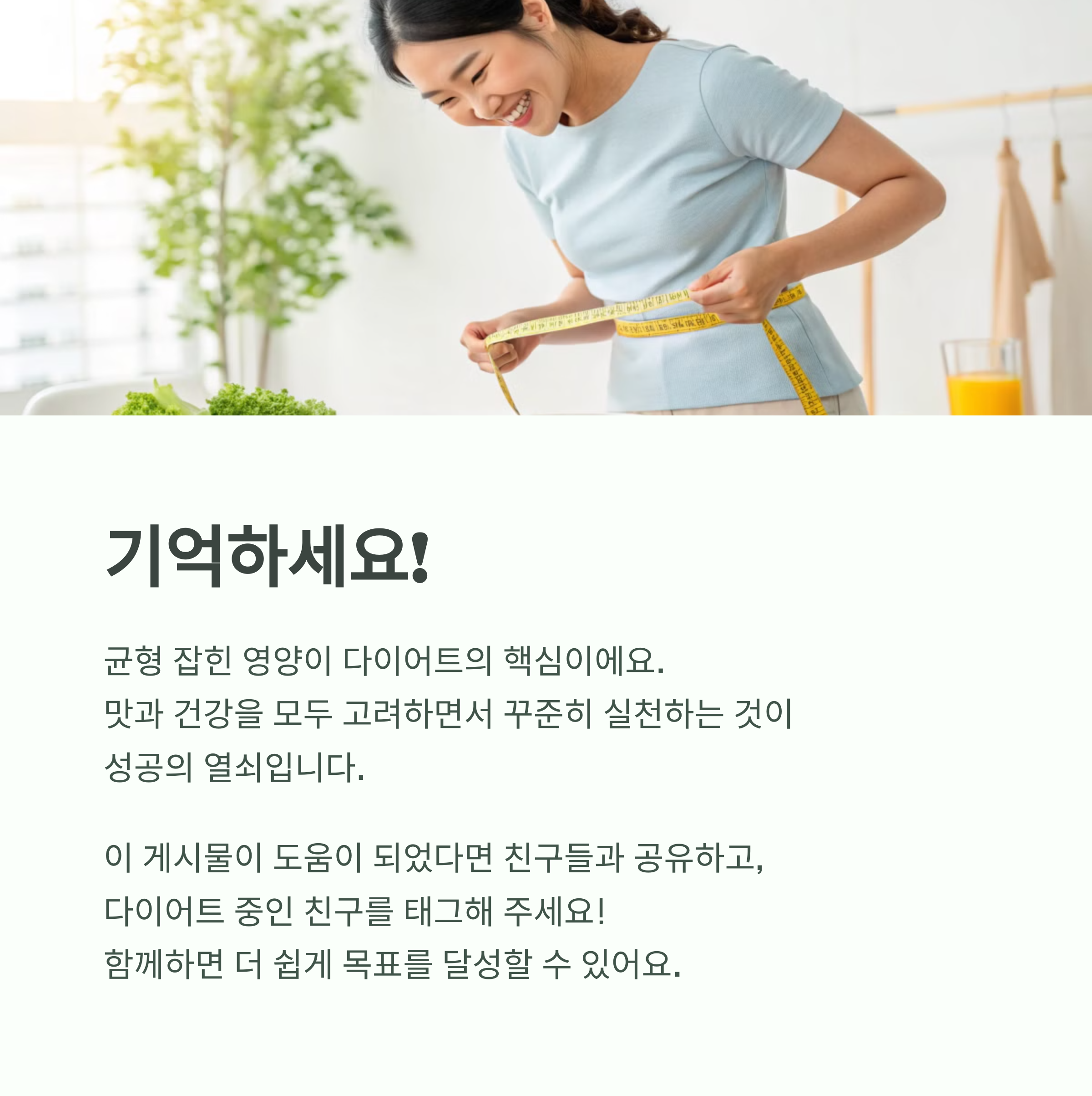 오늘 소개한 레시피처럼 간단하고 맛있는 식단으로 건강하게 체중 조절을 시작해보세요.