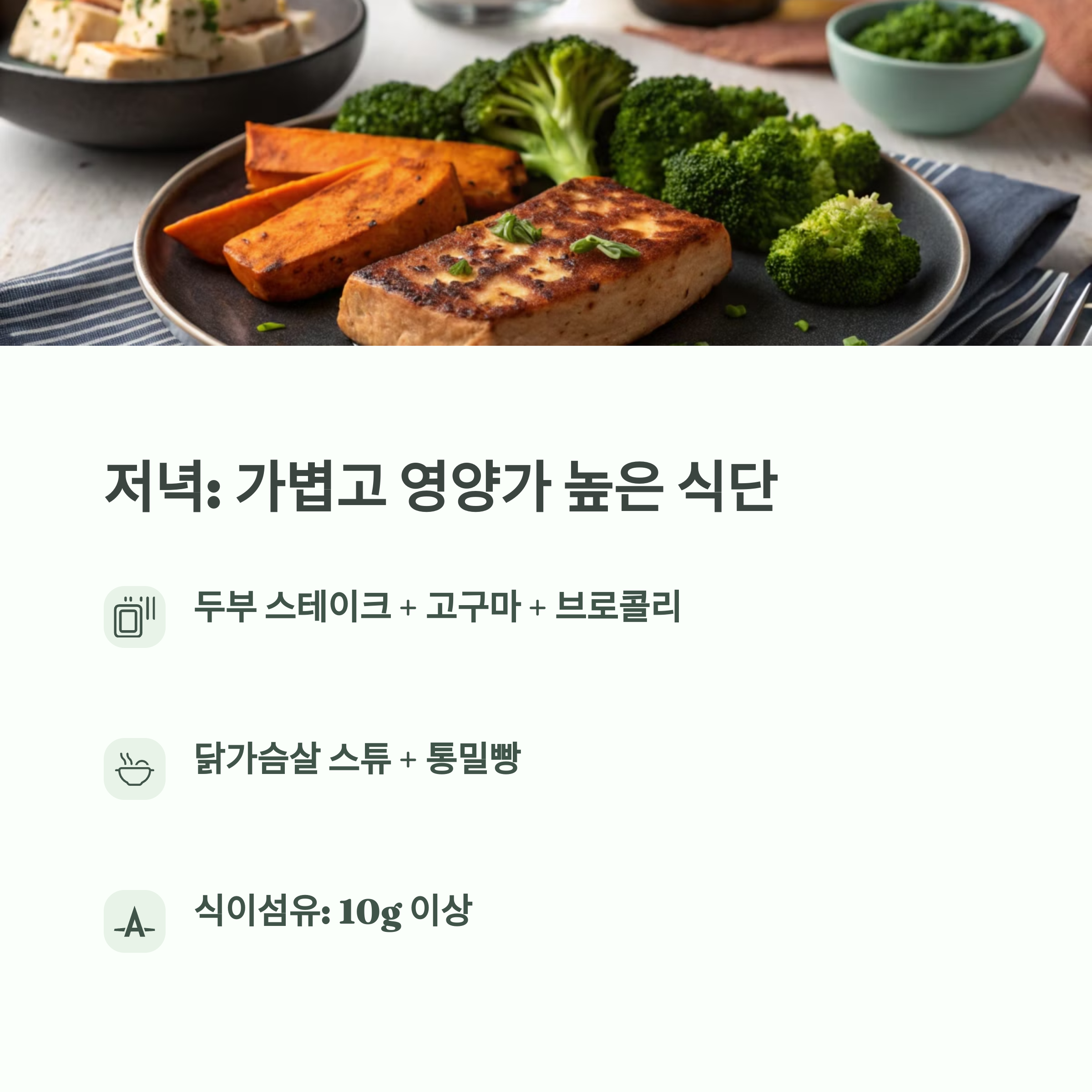 균형 잡힌 영양소, 간단한 조리법, 그리고 무엇보다 '지속 가능성'이 중요해요.
