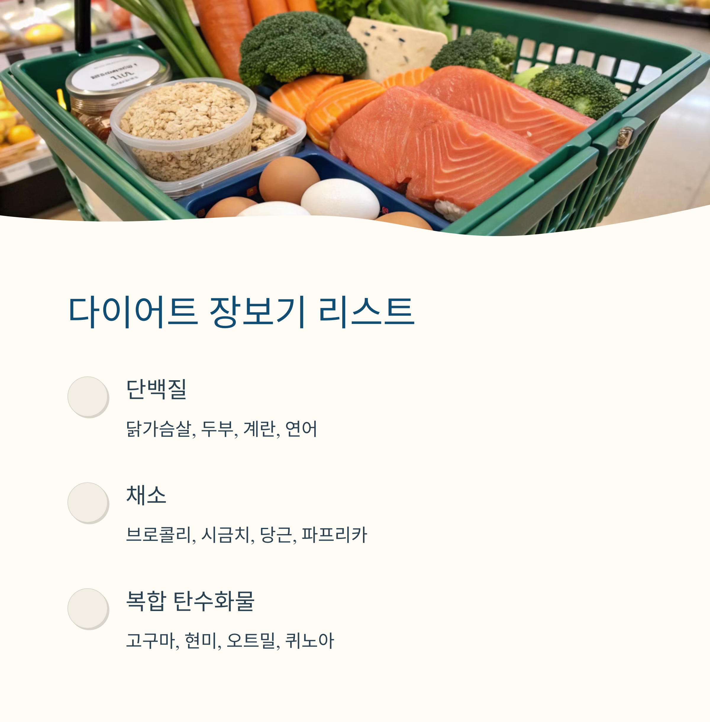 | 단백질 | 닭가슴살, 두부, 계란, 연어, 오징어 |