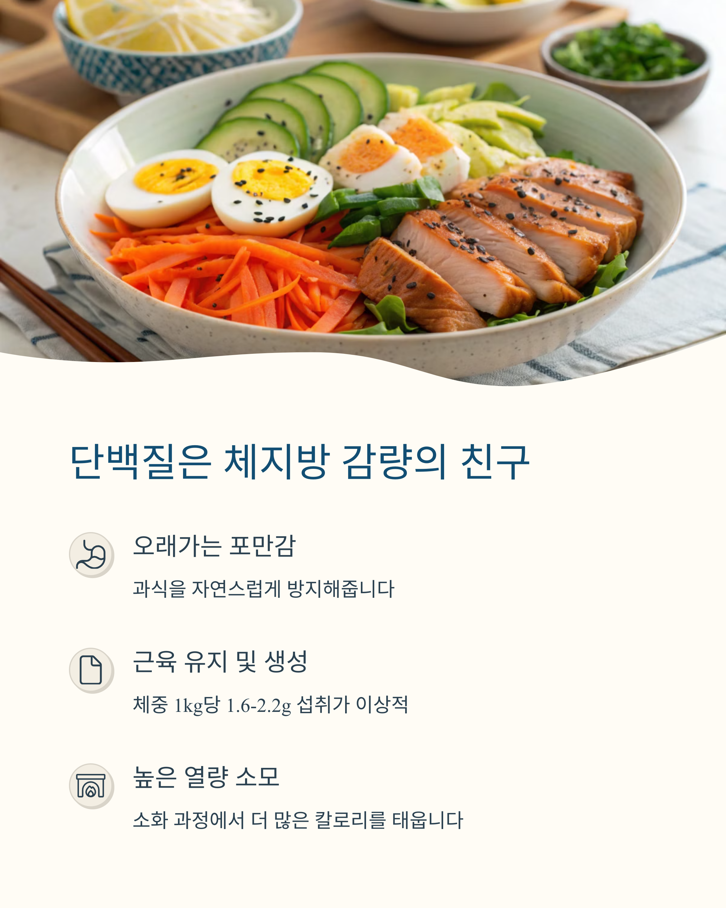 단백질은 포만감을 높이고, 근육 유지에 필수예요.