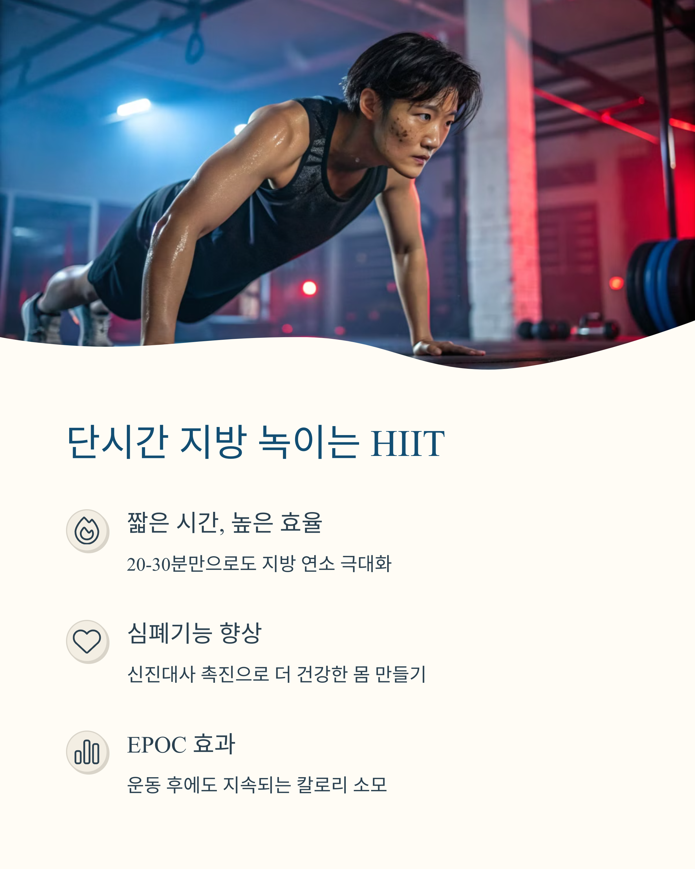 짧고 강하게, HIIT는 운동 후에도 체지방 연소가 계속되는 애프터번 효과가 있어요.