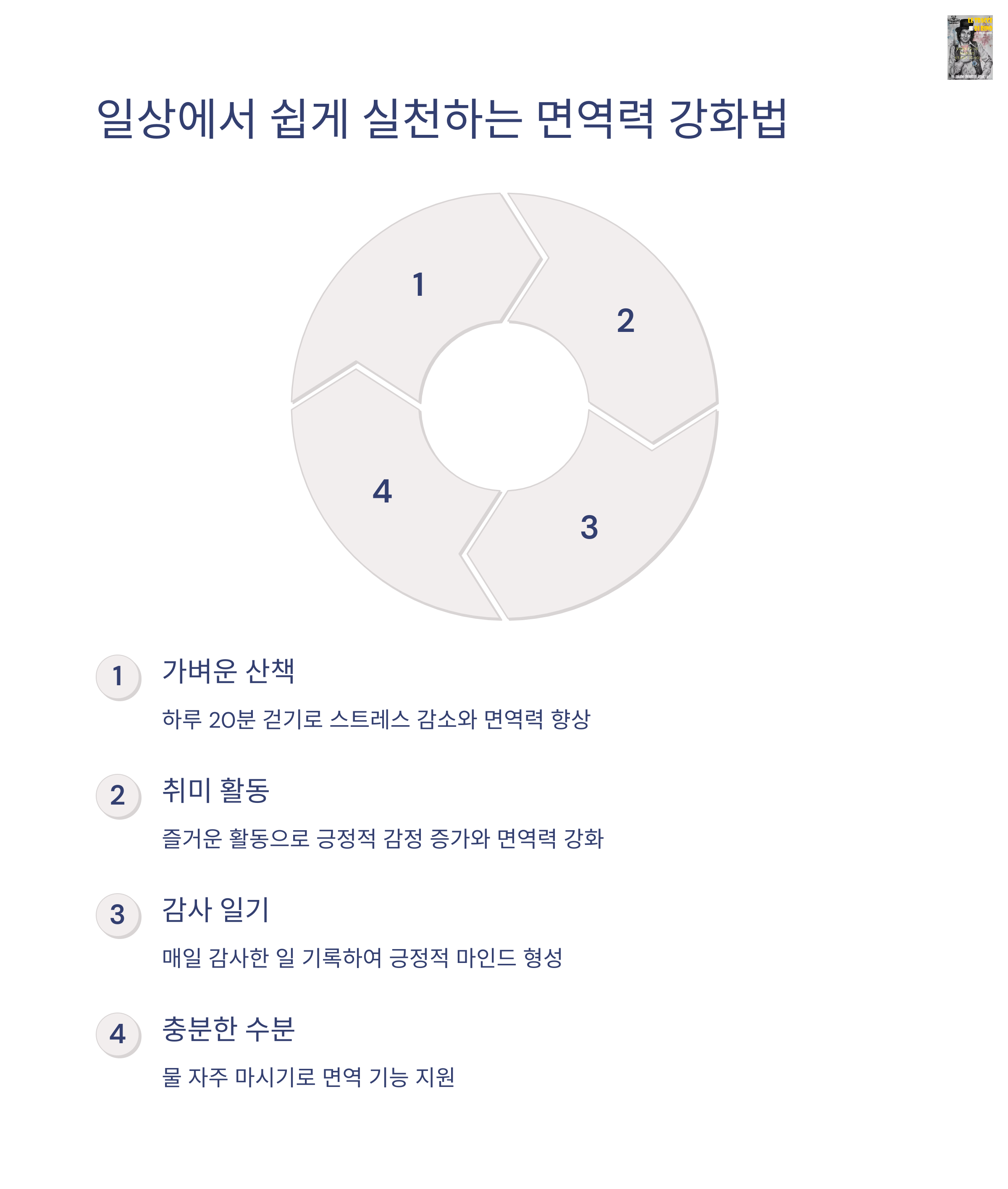 깊은 호흡, 감사 일기 쓰기, 긍정적인 생각 유지 등 간단한 실천이 면역 체계를 보호하는 데 도움을 줍니다.