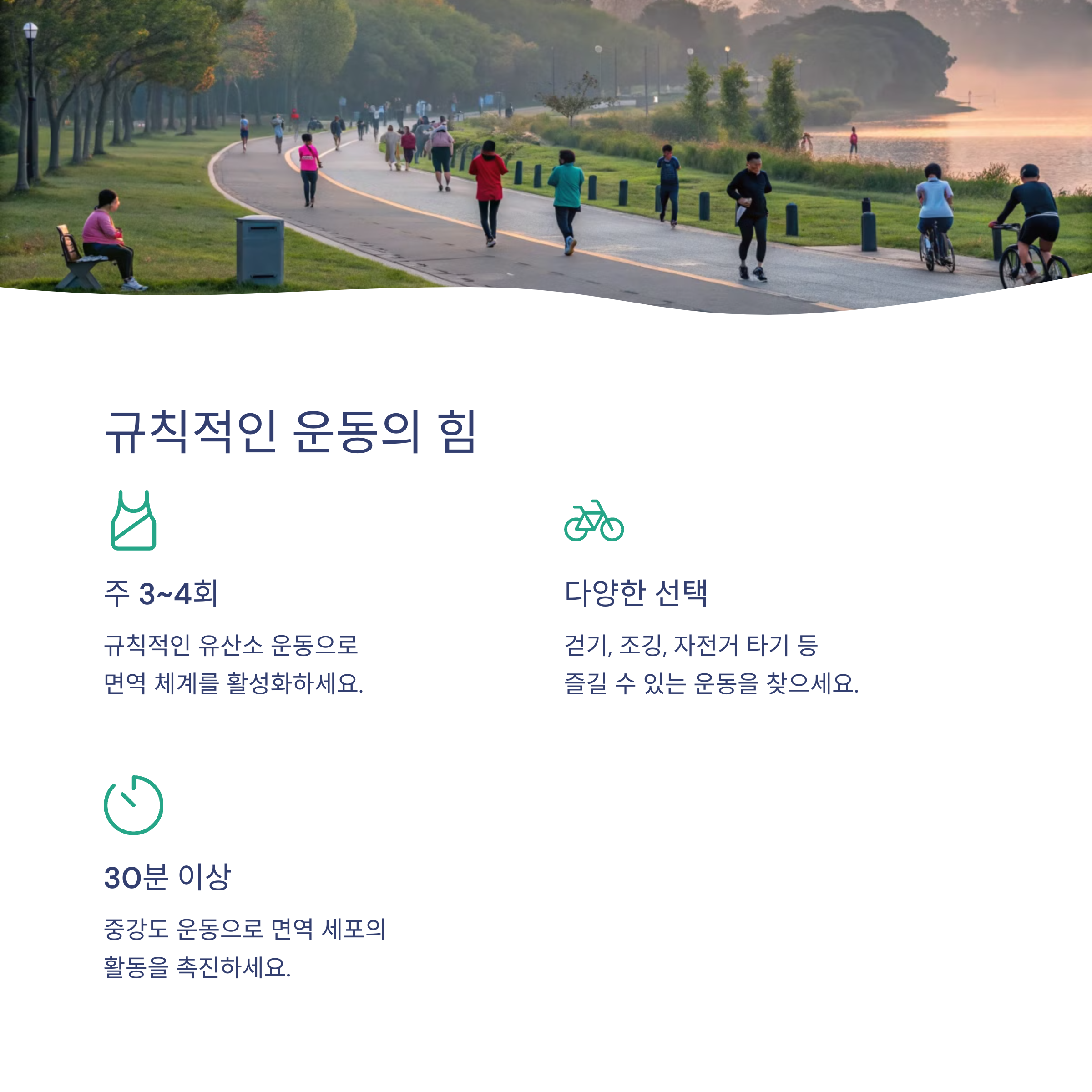 규칙적인 운동은 면역 체계를 활성화시키고, 체내 염증을 줄이는 데 도움을 줍니다.