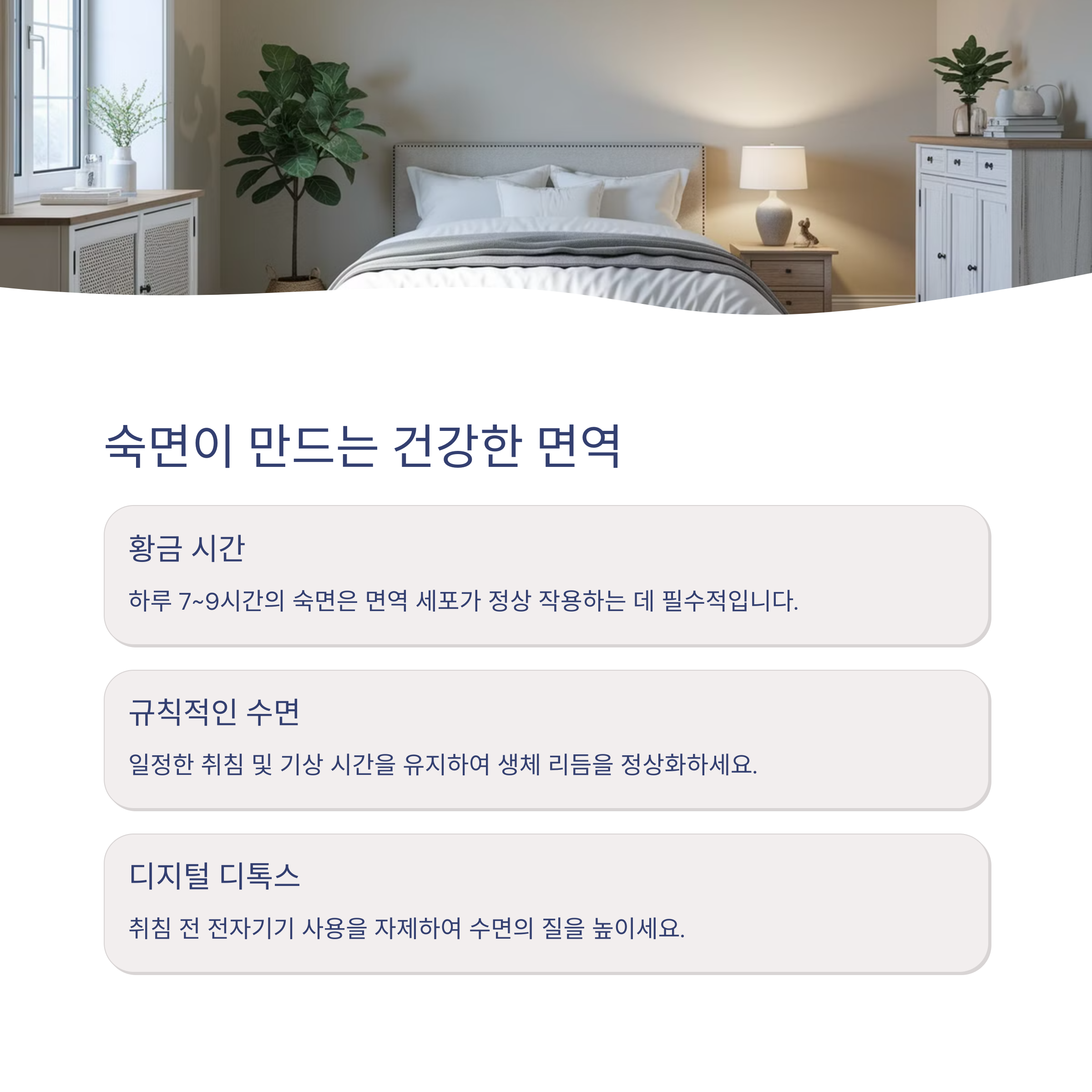 하루 7~9시간의 숙면을 취하고 일정한 수면 패턴을 유지하면 면역 세포가 제대로 활동할 수 있습니다.
