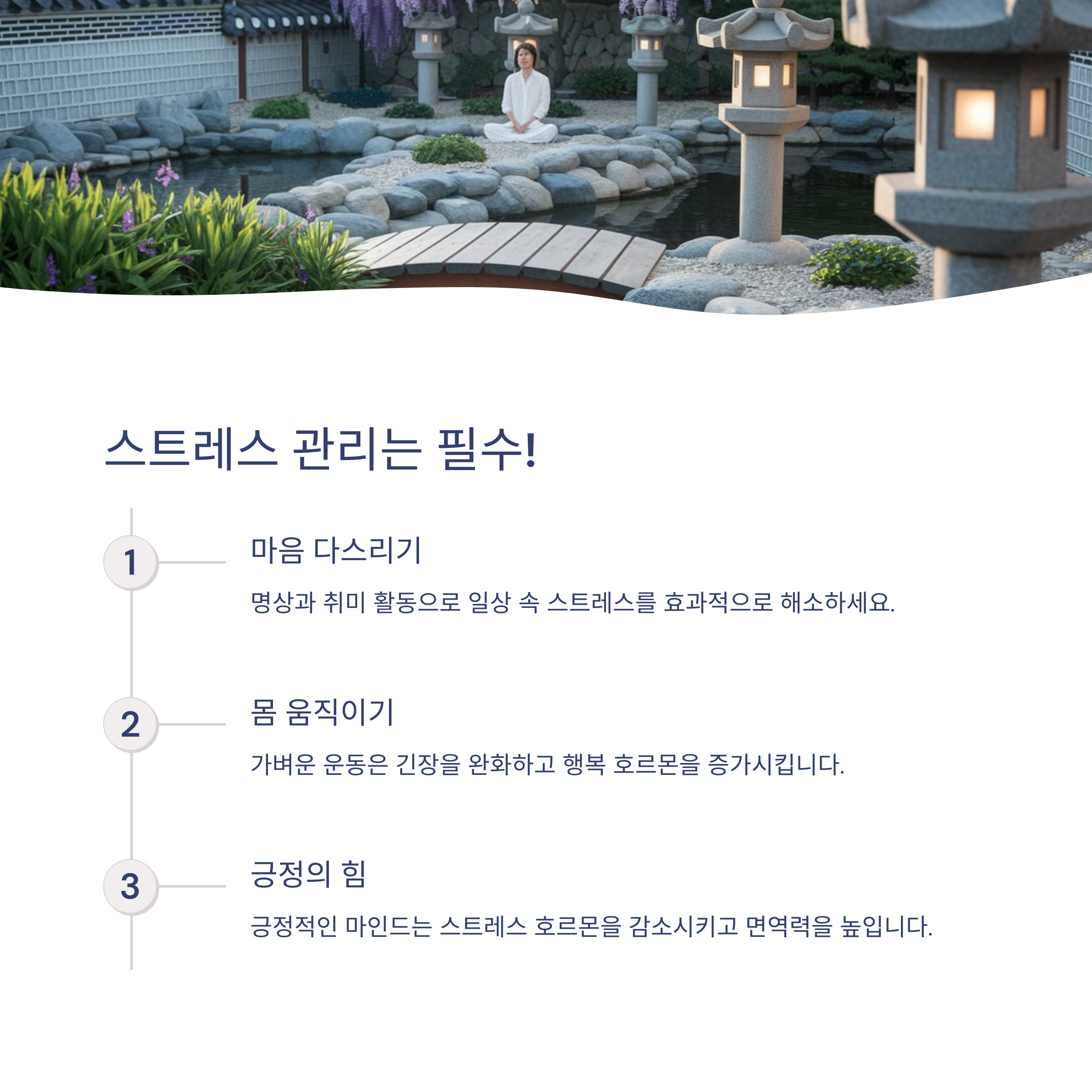 명상, 가벼운 운동, 취미 활동 등을 통해 스트레스를 효과적으로 관리하세요.