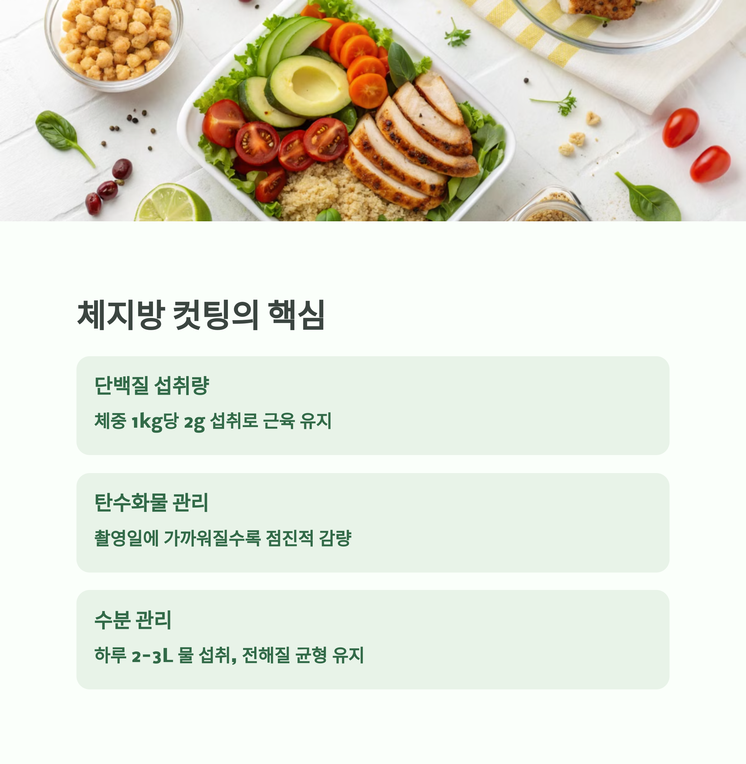 컷팅 단계에서는 탄수화물을 줄이고, 단백질과 채소 위주 식단으로 조절하는 것이 효과적입니다.