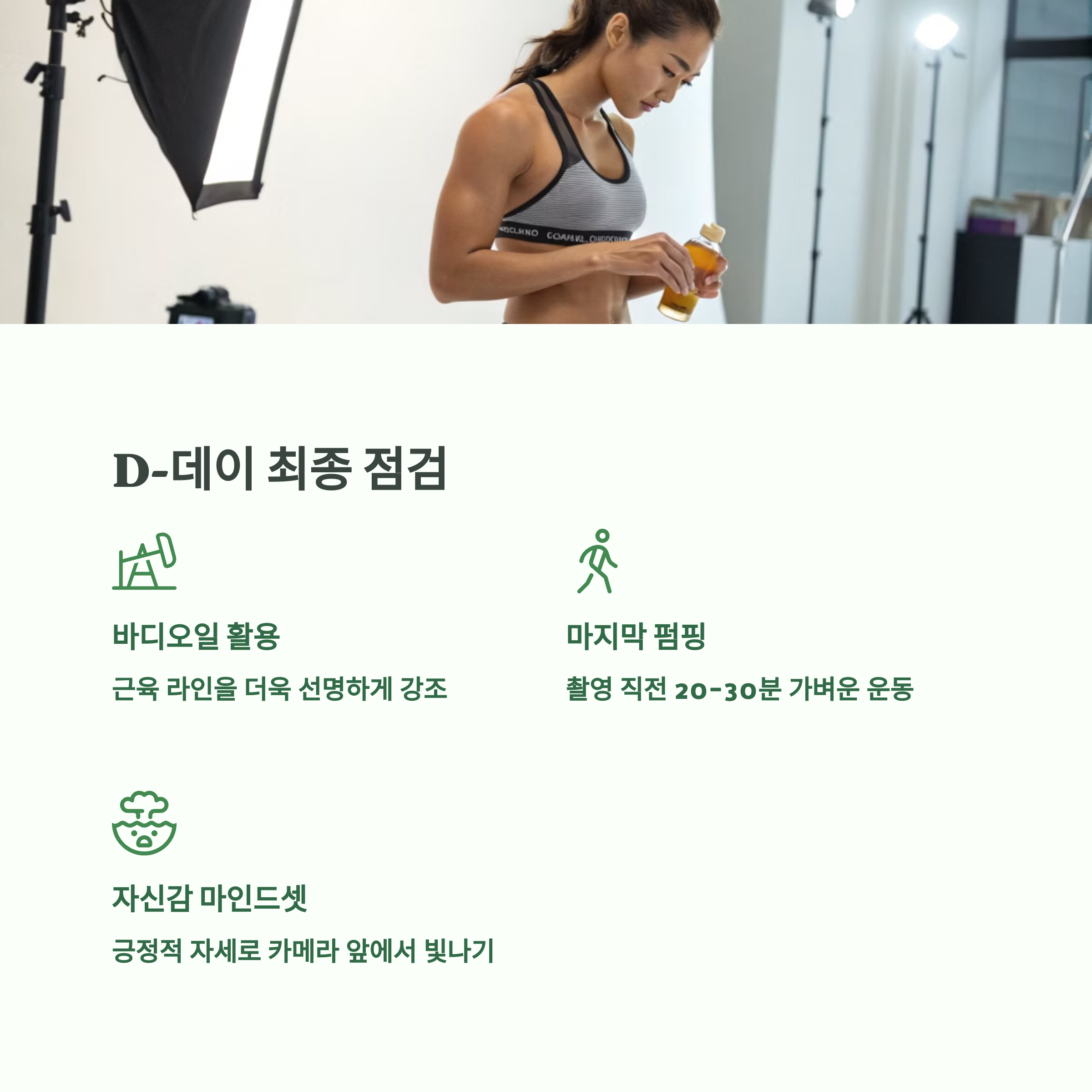 근육의 선명도와 피부 광택을 살리기 위해 필수예요. 사진 결과물에 큰 차이를 줍니다.