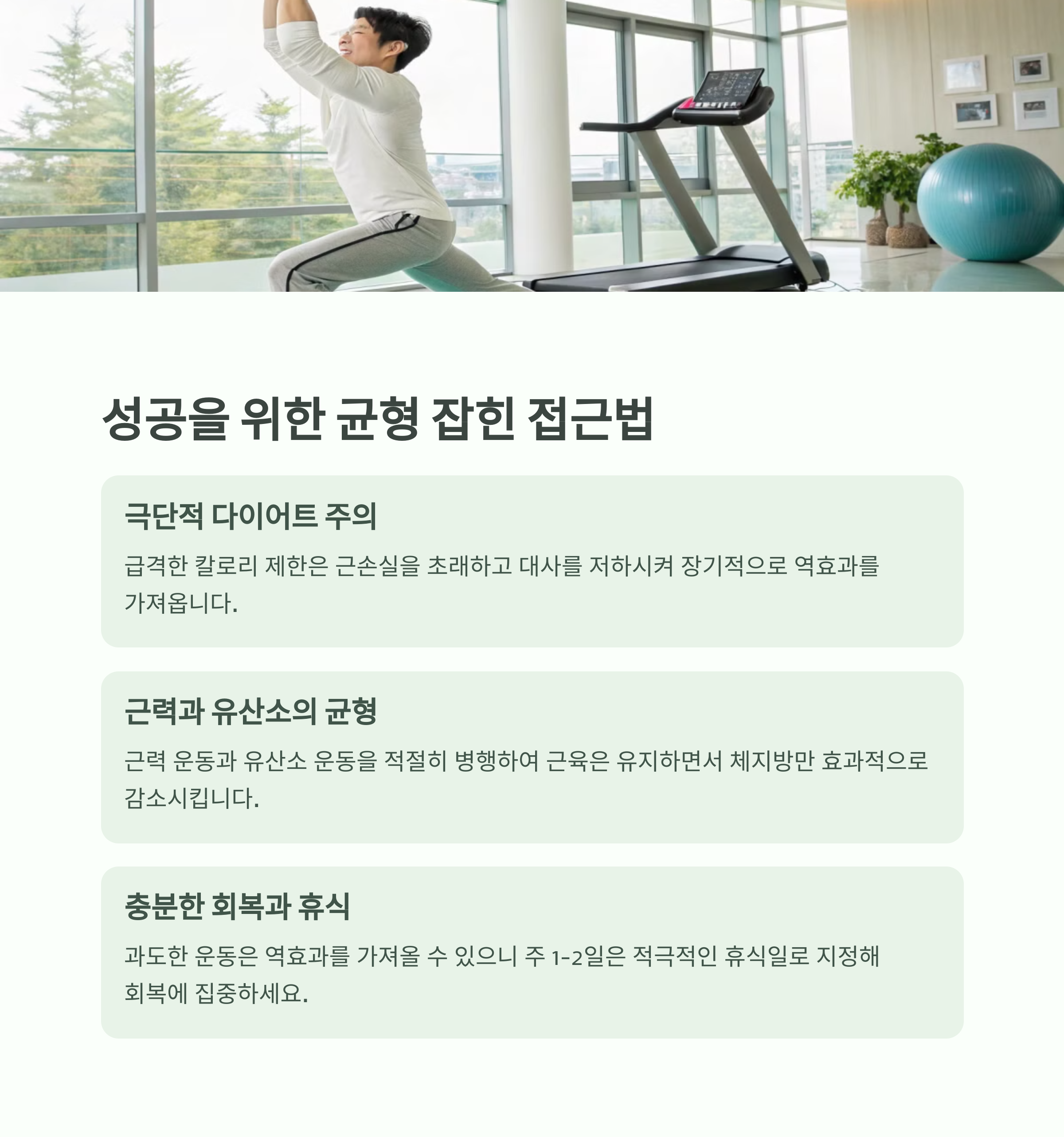- 유산소만 집중: 근력 운동 없이 유산소만 하면 탄력 있는 몸을 만들기 어렵습니다.