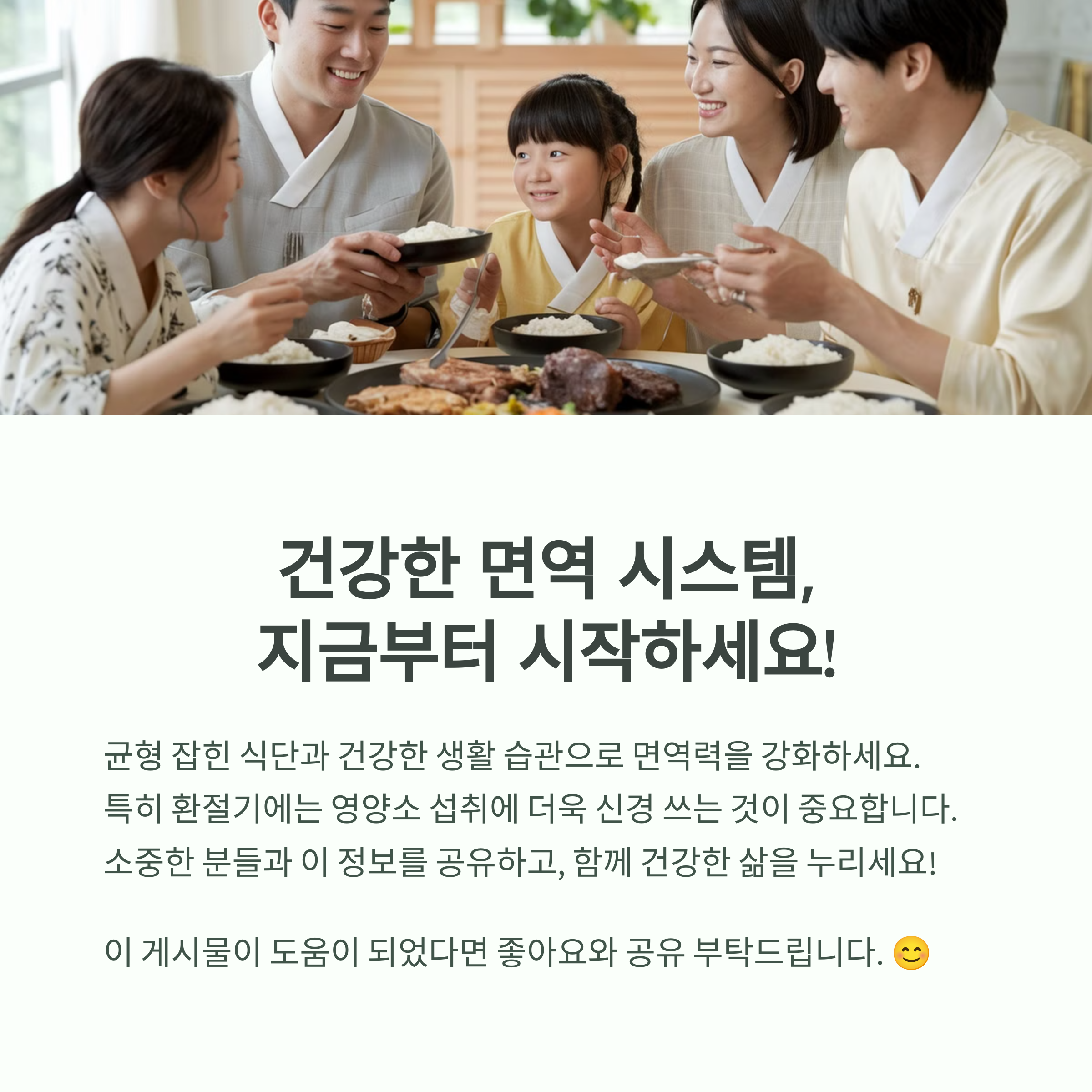 특히 면역 기능이 저하되기 쉬운 환절기에는 영양소 보충과 함께 올바른 생활 습관을 실천하는 것이 중요합니다.