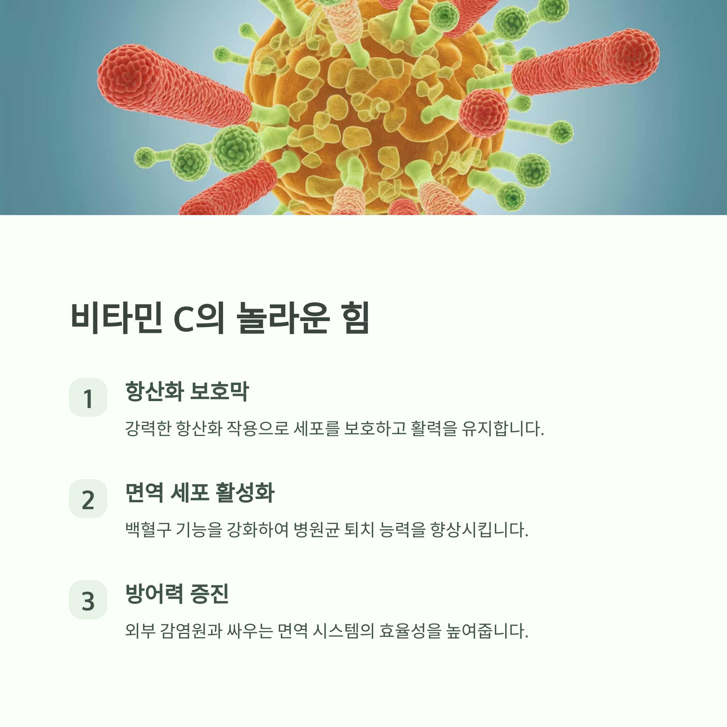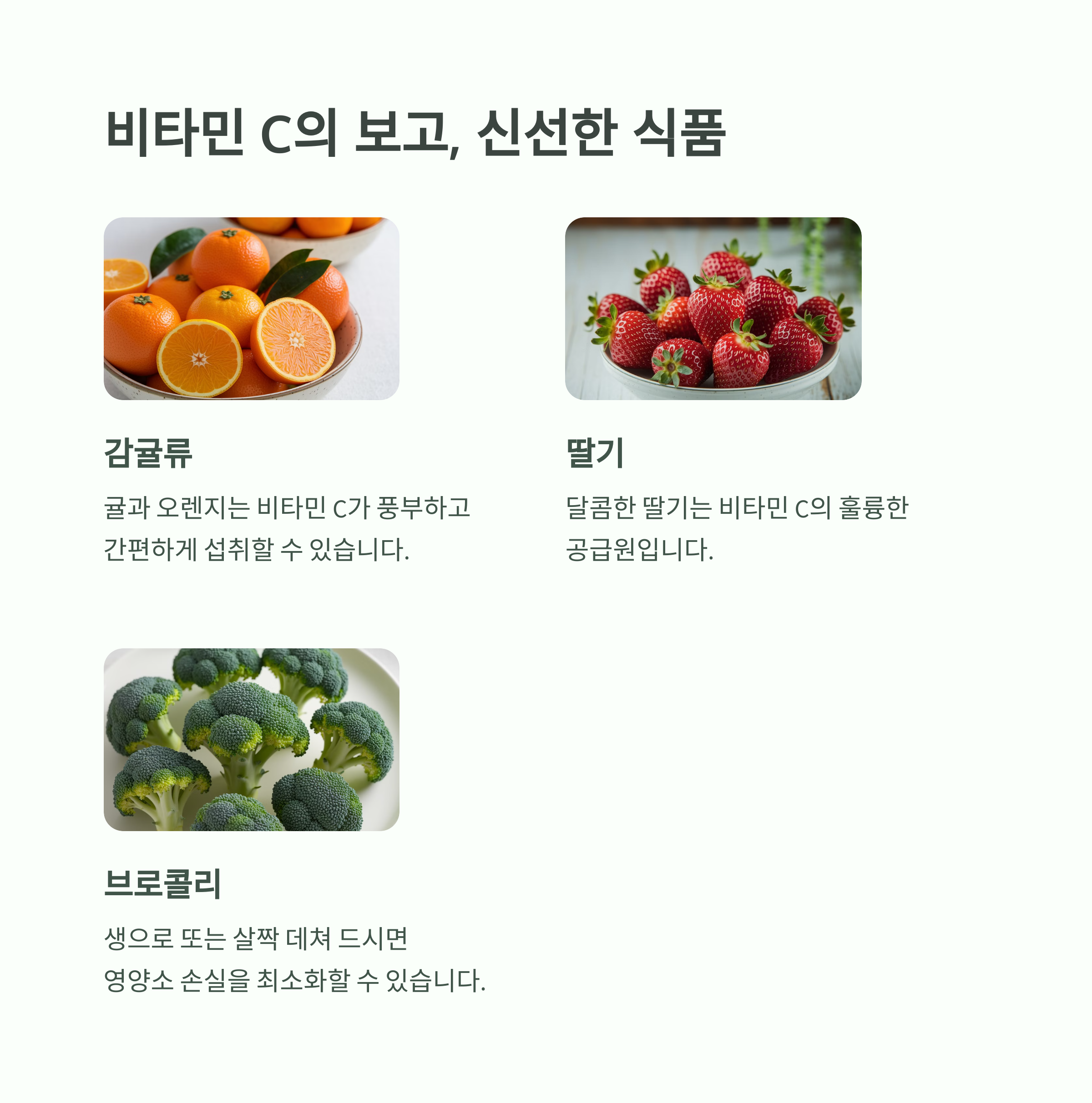 특히 비타민 C는 강력한 항산화 작용을 하며, 백혈구의 기능을 활성화하여 외부 병원균과 싸우는 힘을 길러줍니다.