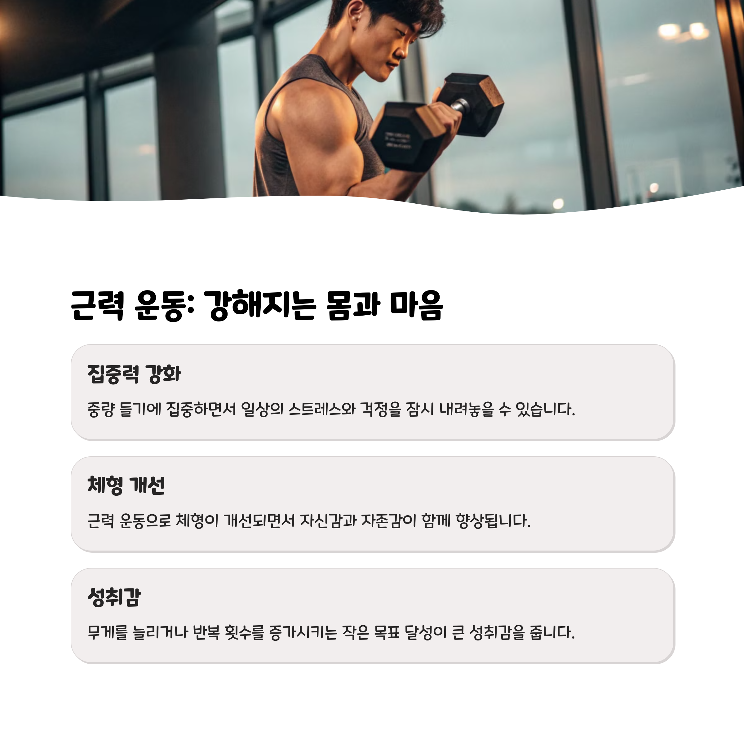 근력 운동은 단순한 근육 강화뿐만 아니라 스트레스 해소에도 큰 도움이 됩니다.