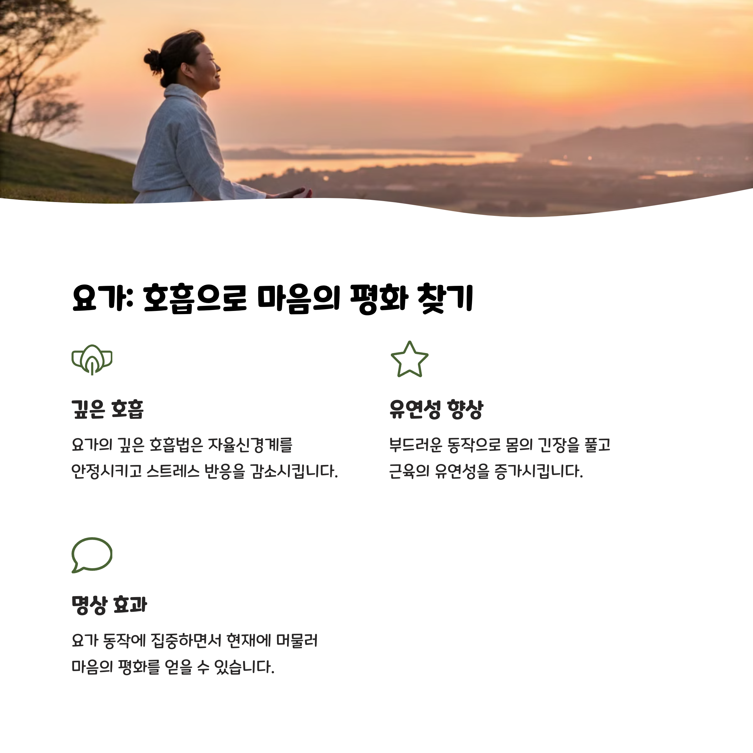 요가는 신체적 유연성을 높여줄 뿐만 아니라, 정신적인 안정감을 주는 운동입니다.