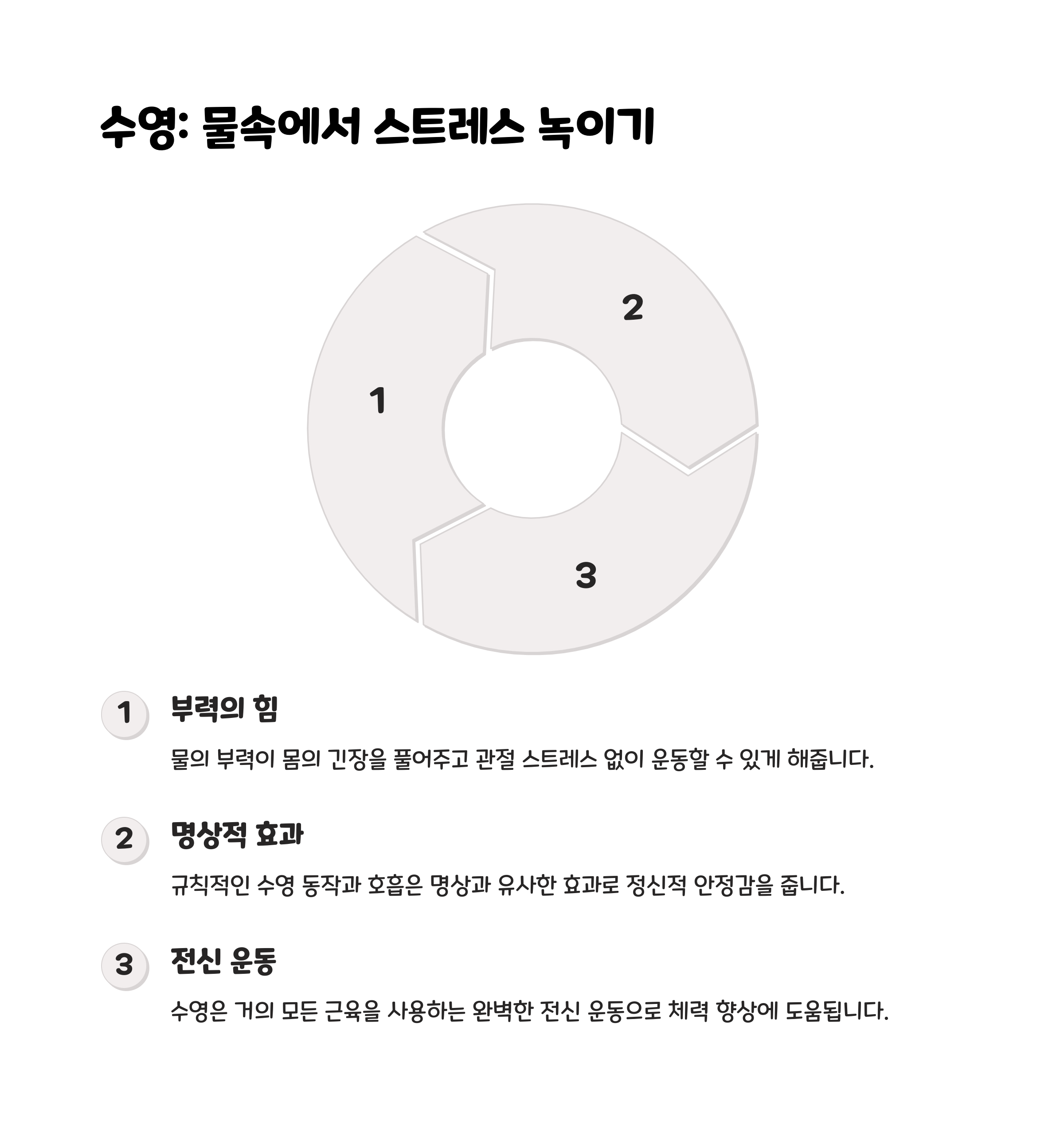 물속에서의 부력은 마치 몸이 가벼워진 듯한 느낌을 주어 스트레스 해소에 탁월합니다.