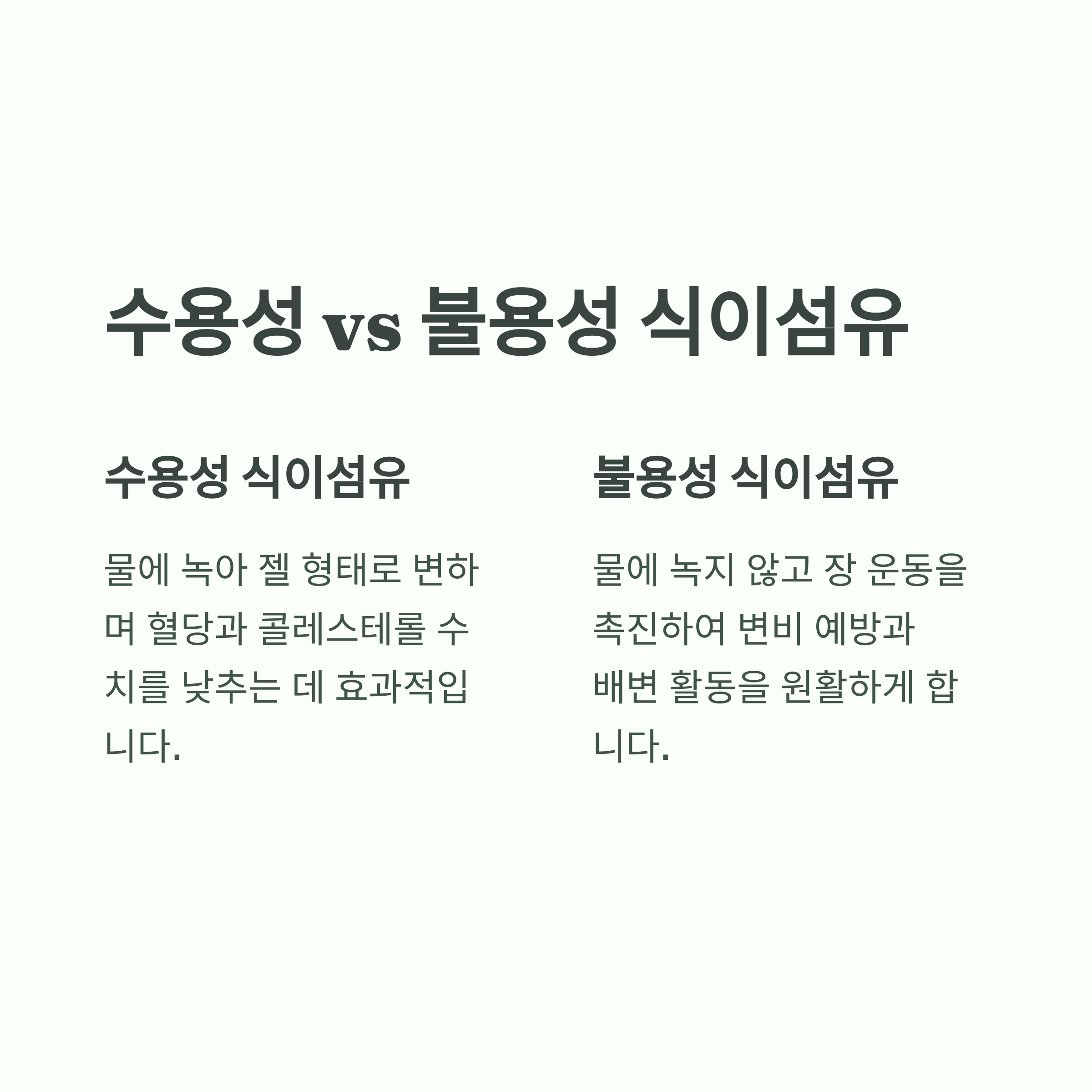 식이섬유는 크게 두 가지로 나뉘어요: 수용성과 불용성.