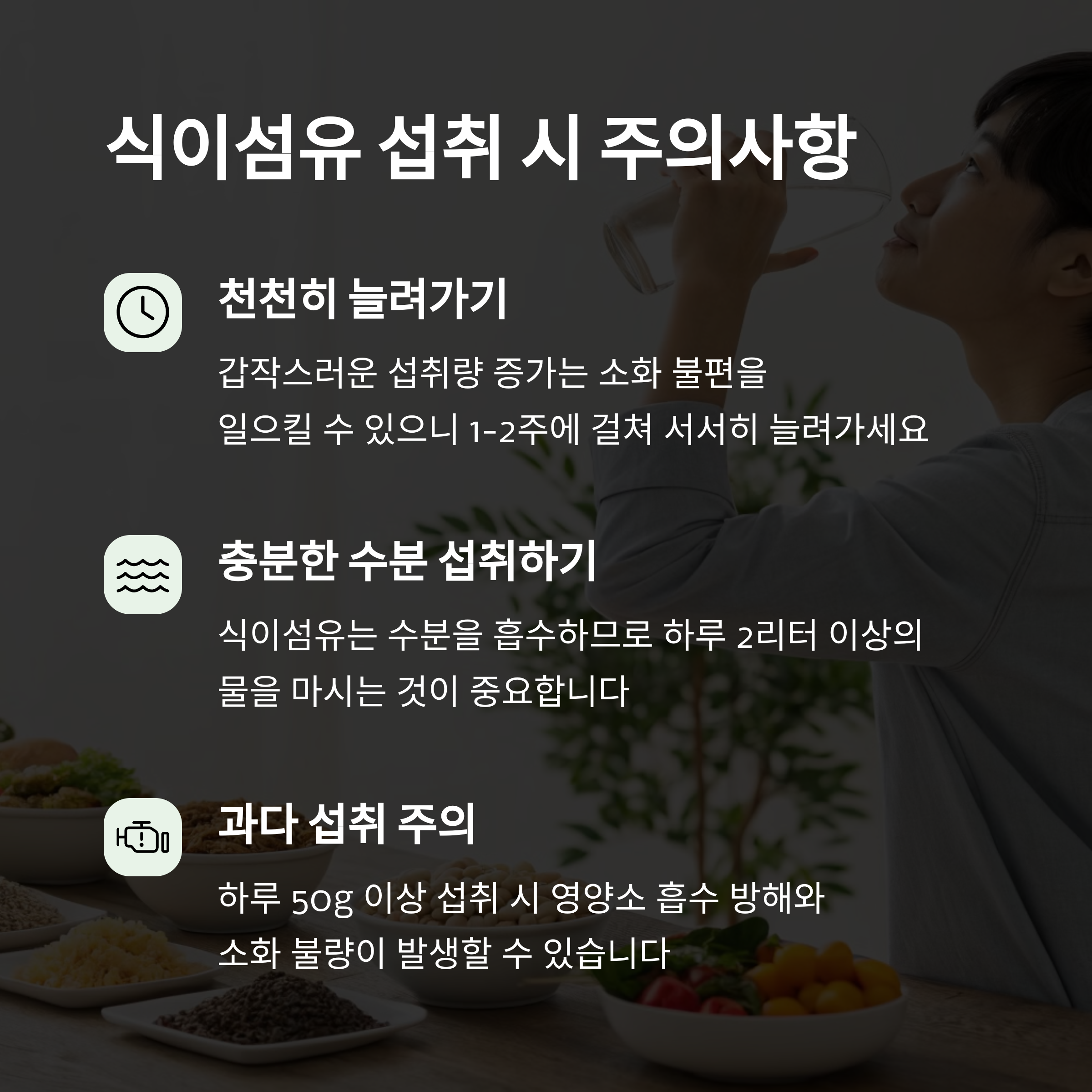 식이섬유를 갑자기 너무 많이 섭취하면 장이 놀랄 수 있어요. 점진적으로 늘려야 부작용을 줄일 수 있어요.