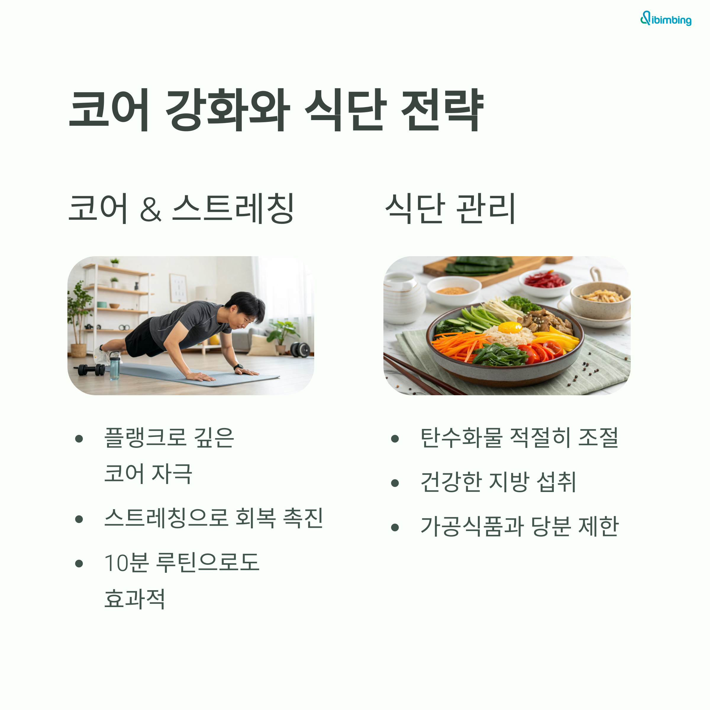 - 주 4회 근력 운동 (스쿼트, 런지, 플랭크 등)