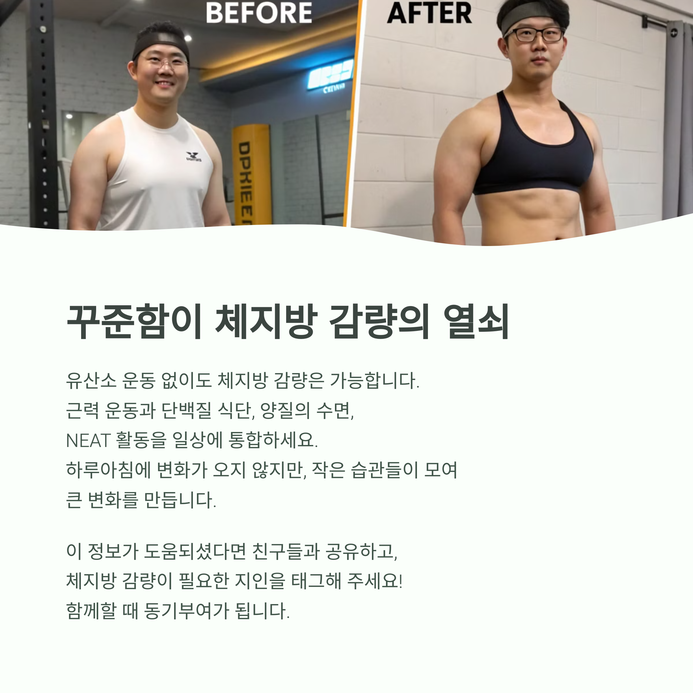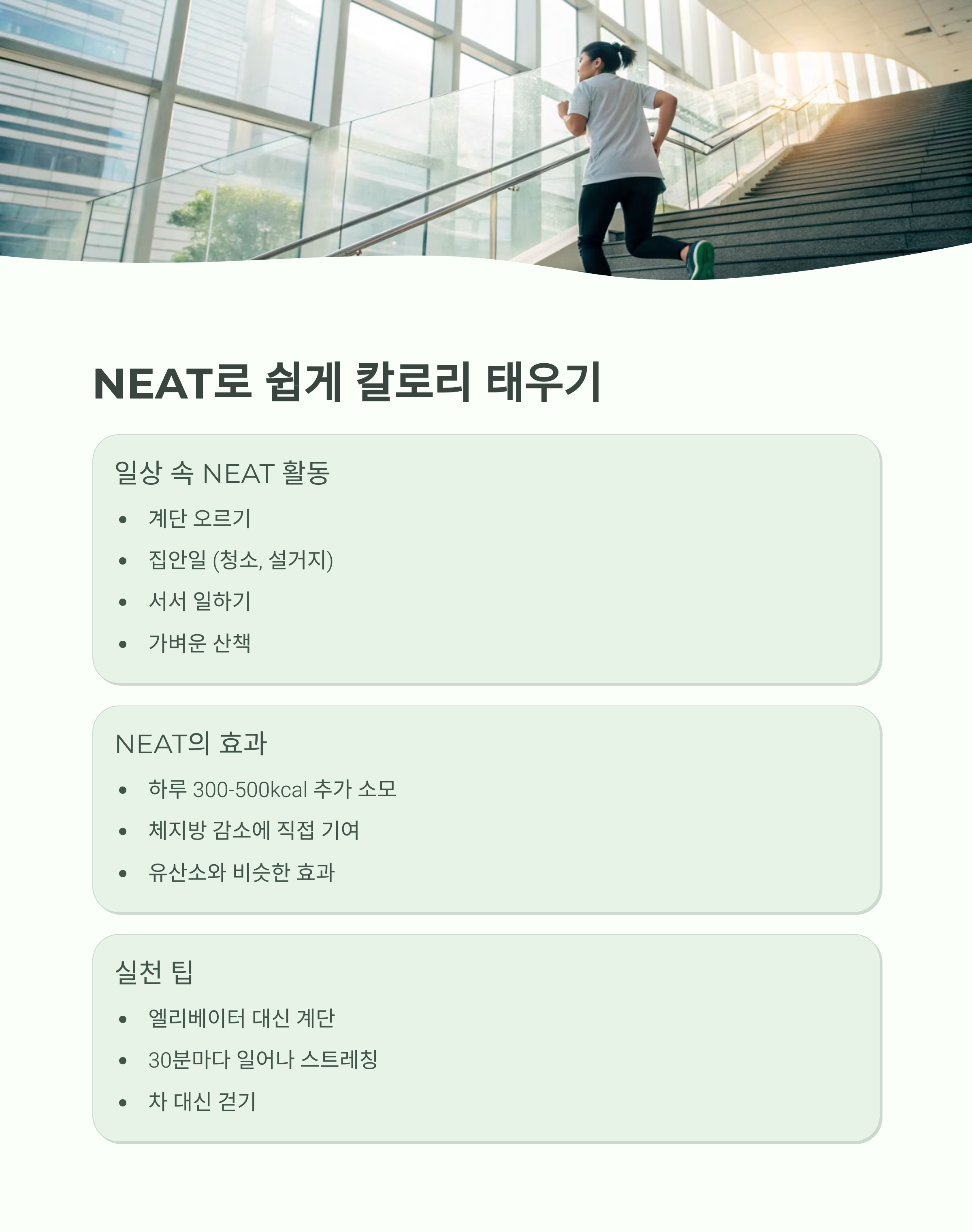 NEAT(비운동성 활동 열량소모)는 일상 속 움직임을 통해 유산소 운동 없이도 체지방 감량에 큰 도움을 줍니다.