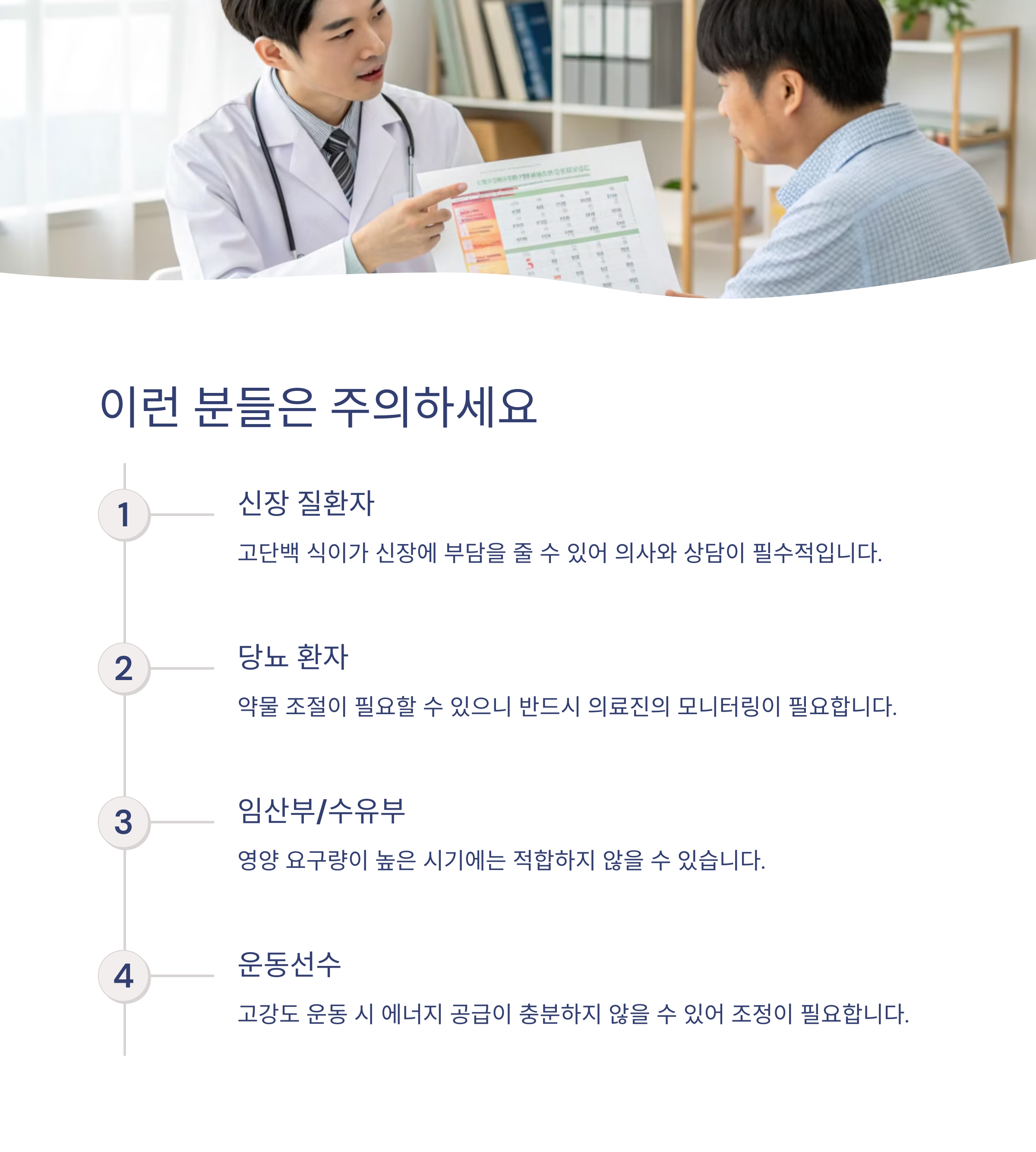 | 신장 질환자 | 단백질 섭취 증가가 신장 부담을 줄 수 있습니다. |