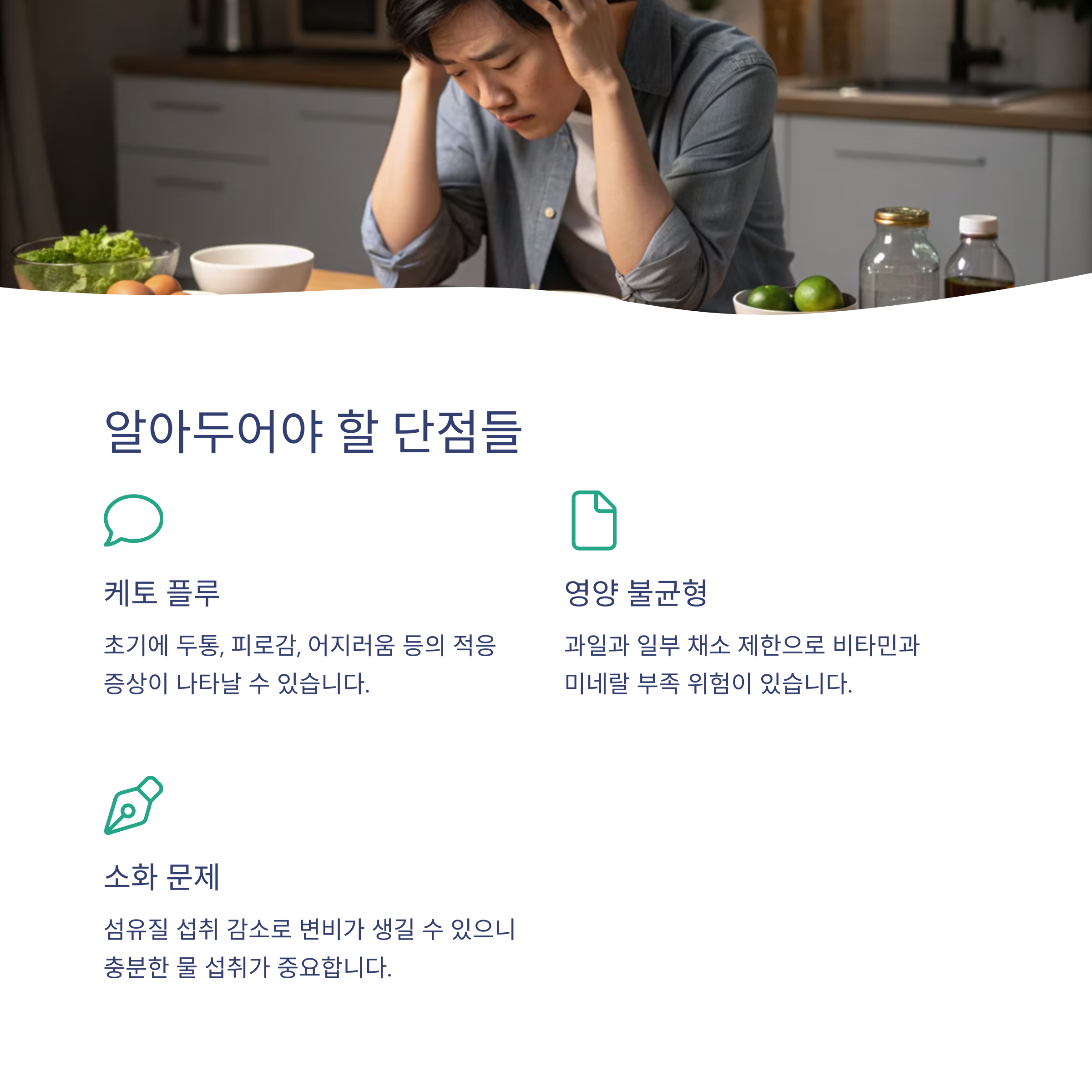 - 장기 지속 어려움: 탄수화물 제한이 강해 오랜 기간 유지하기 힘들 수 있습니다.