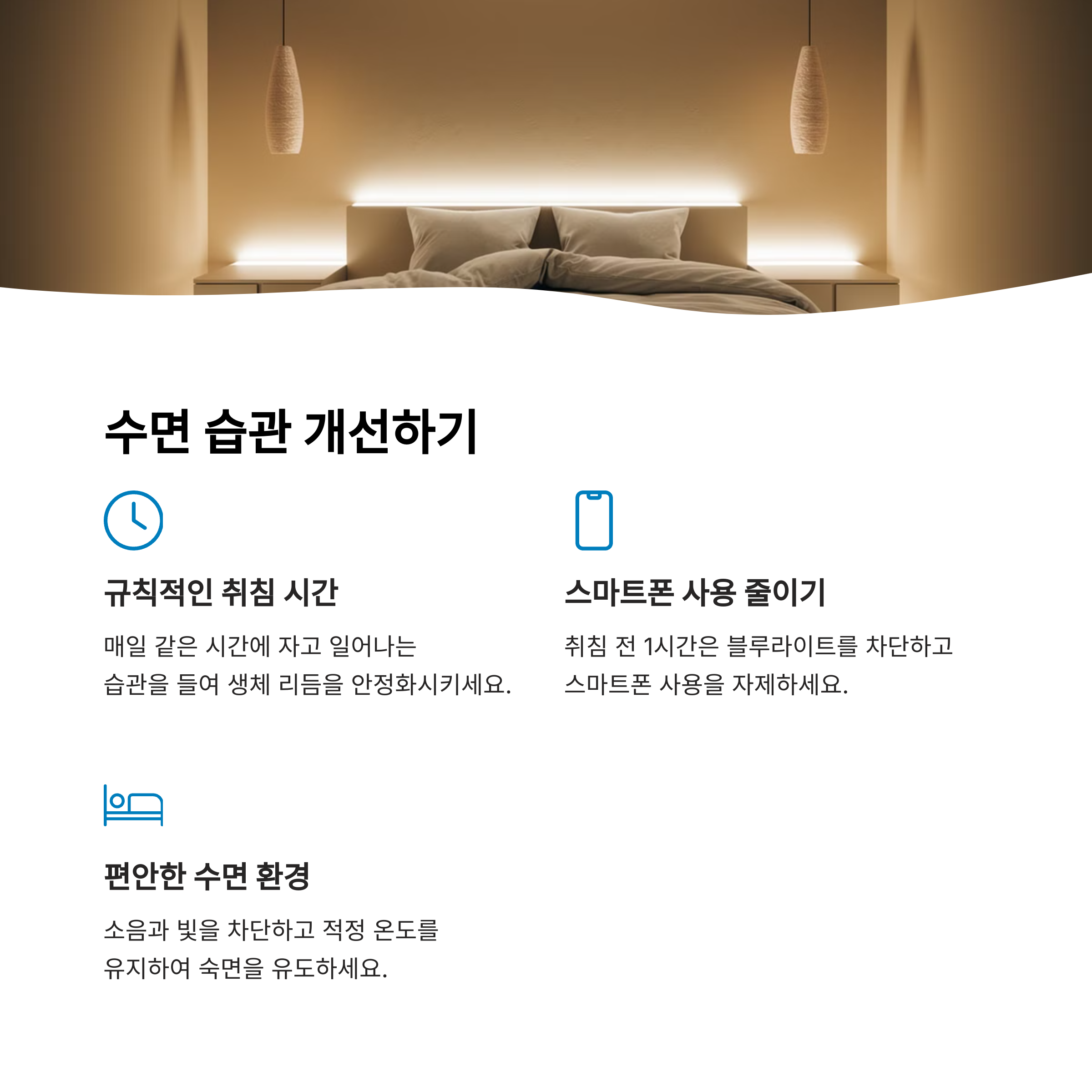 매일 같은 시간에 자고 일어나는 패턴을 만들고, 취침 전에는 스마트폰 사용을 줄이는 것이 도움이 됩니다.