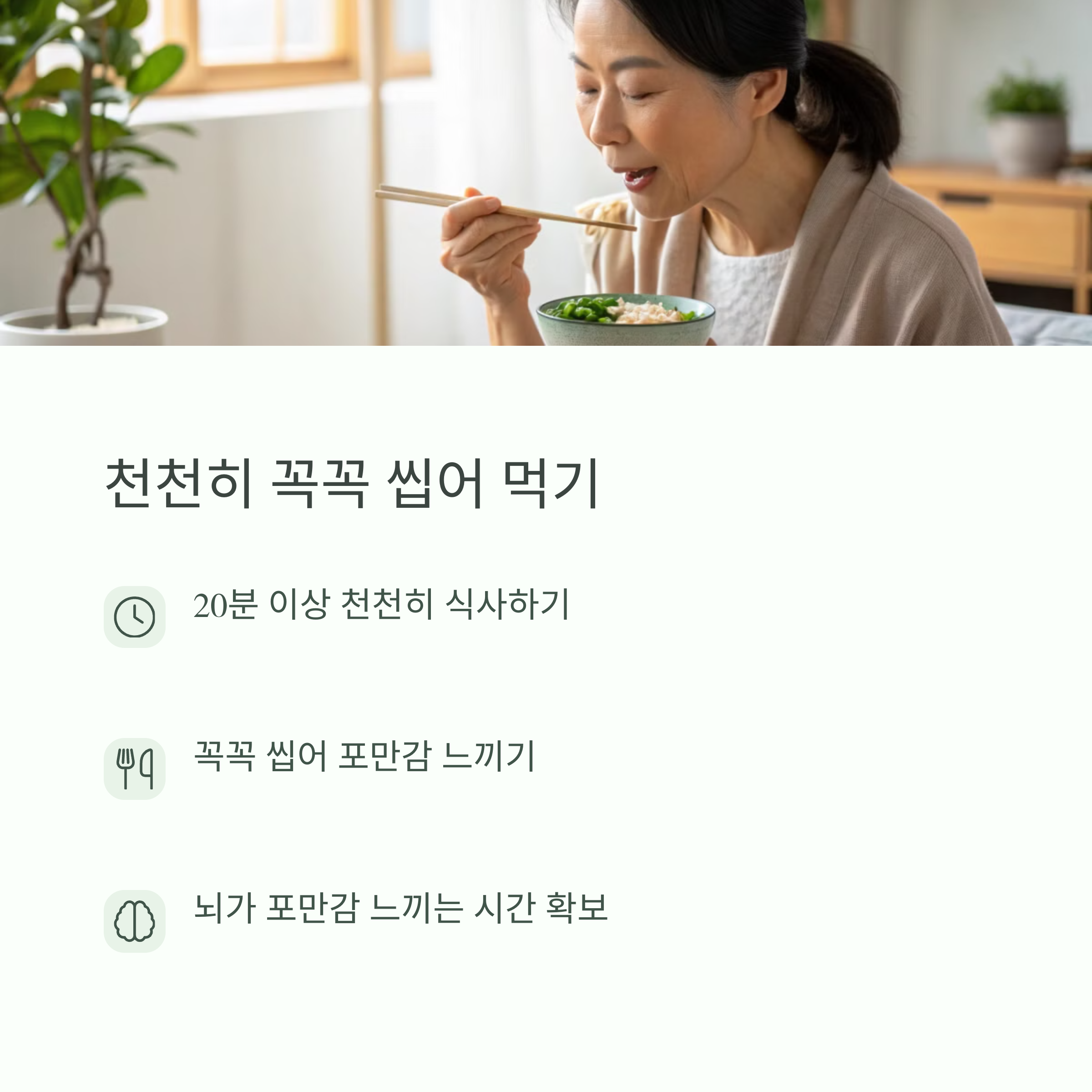 | 20회 이상 꼭 씹기 | 소화 촉진, 뇌의 포만감 신호 인식 |