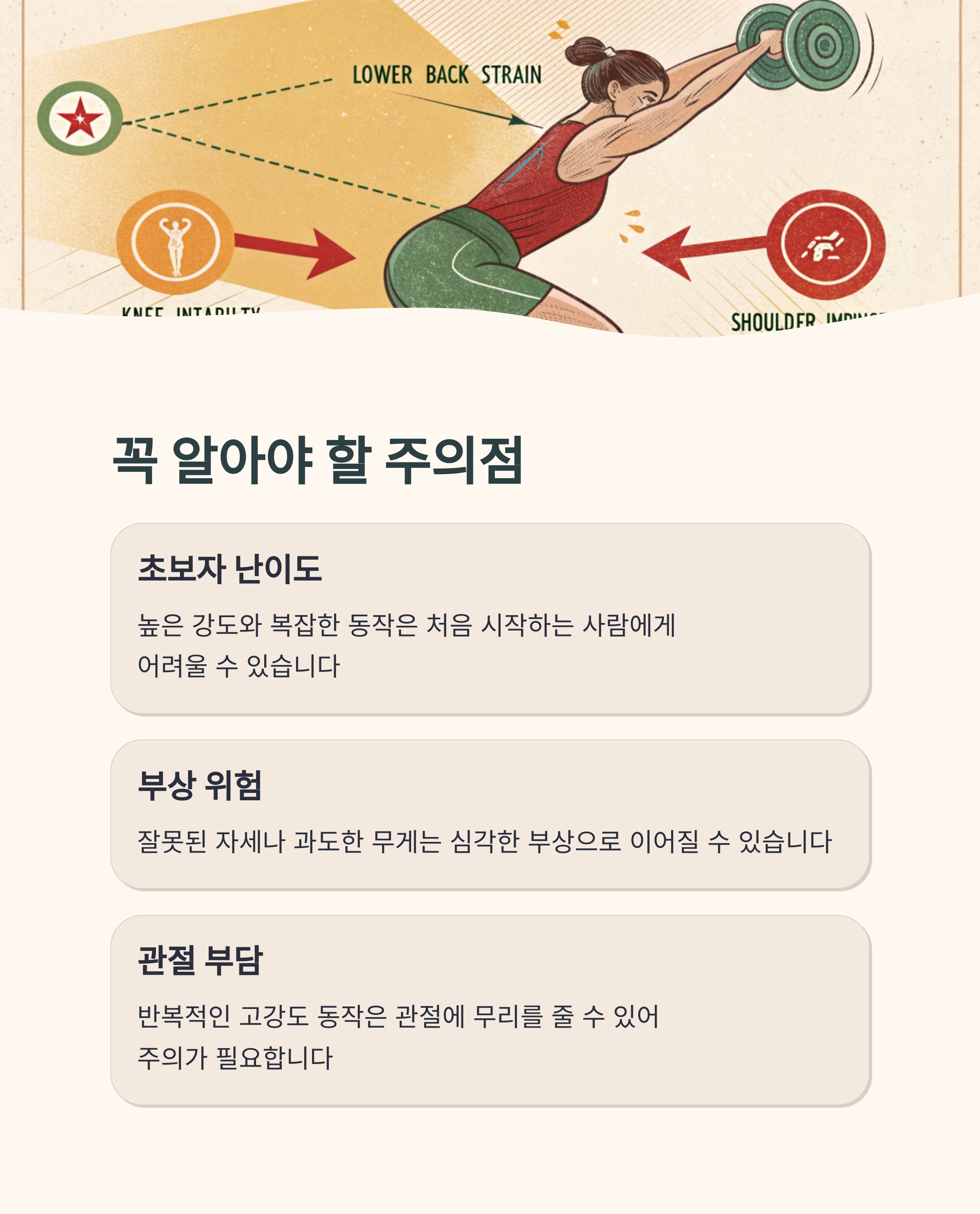 강도가 높은 만큼 부상 방지를 위해 적절한 자세와 강도 조절이 필요합니다.