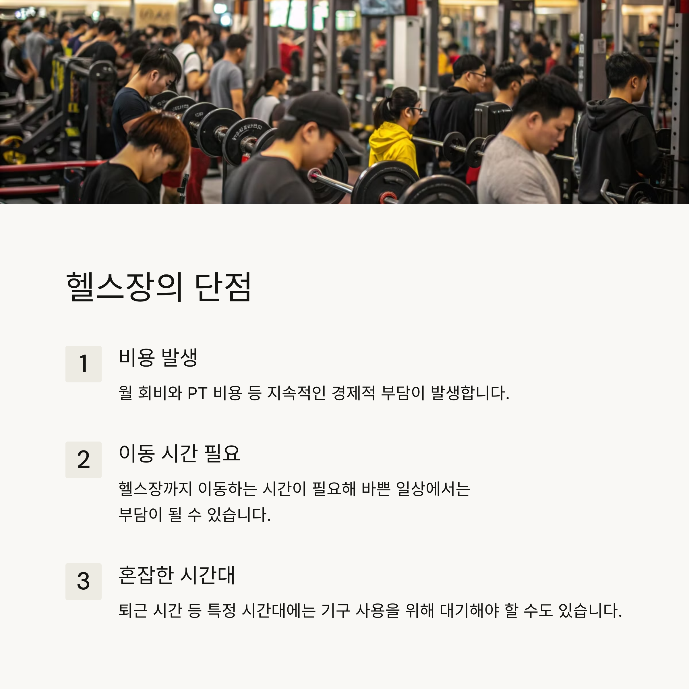 하지만, 매달 헬스장 비용이 발생하며 이동 시간이 필요하다는 점이 단점입니다.