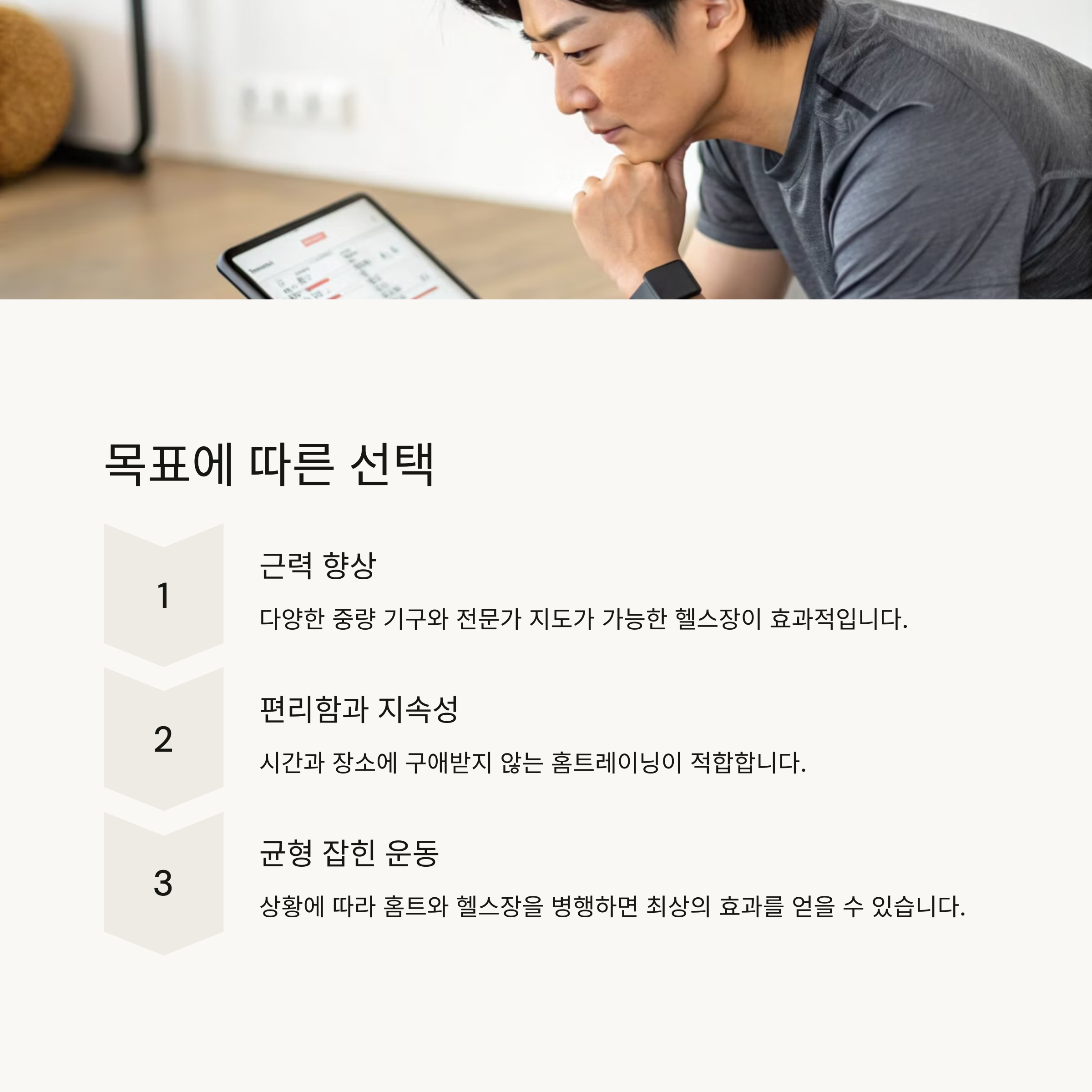 | 홈트레이닝 장점 | 헬스장 운동 효과 | 지속 가능한 운동 |