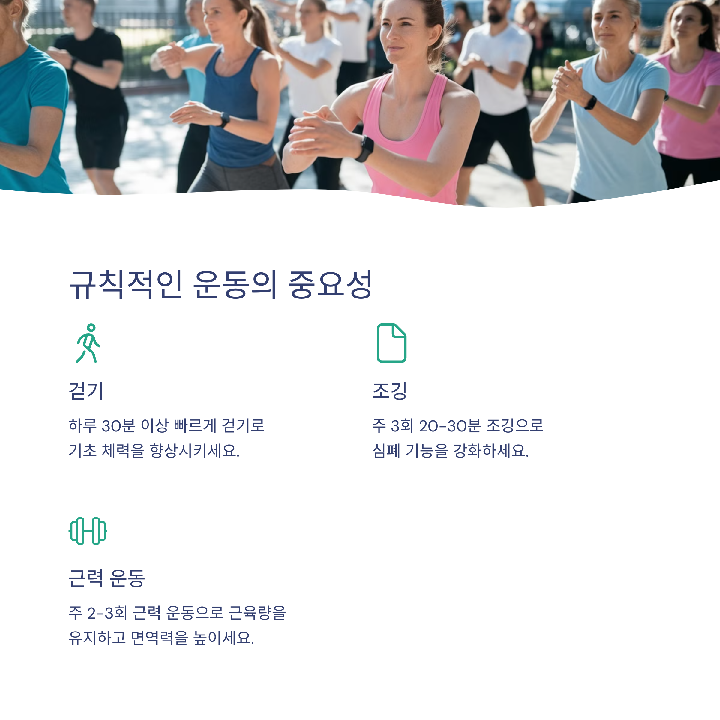 | 비타민 C, D, 아연 | 걷기, 조깅, 근력 운동 | 7~9시간 숙면 |