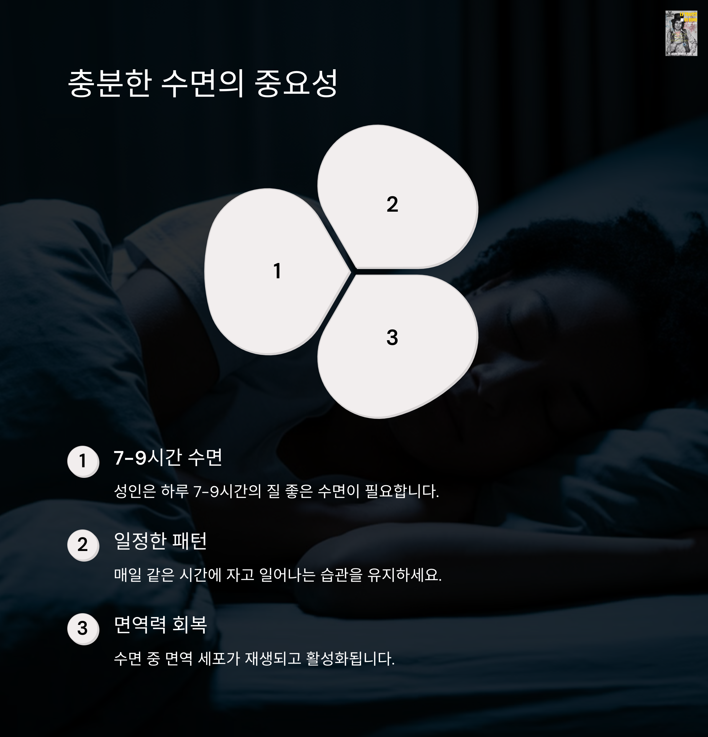 하루 7~9시간의 숙면을 유지하고, 일정한 수면 패턴을 유지하는 것이 면역력 강화에 큰 도움이 됩니다.